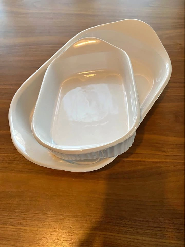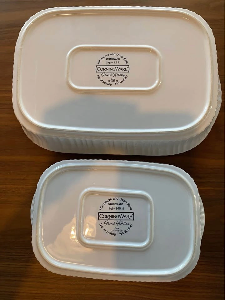 CorningWare French White Stoneware Casserole Dishes – 2 qt (1.9 L) and 1 qt (945 ml) sizes. Microwave and oven safe, classic design, no stovetop or broiler use. Both dishes are in excellent, clean condition and perfect for baking, serving, and storing meals.
