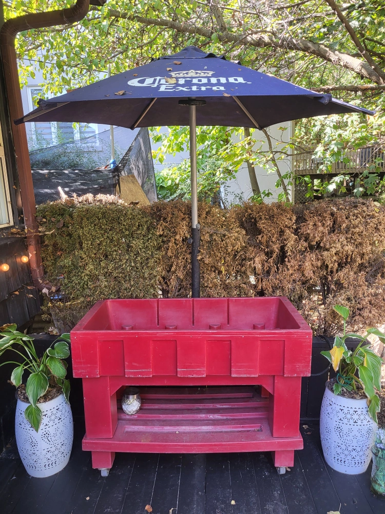 Selling a Corona Extra umbrella paired with a red beverage cooler. The umbrella features the Corona Extra logo. The cooler is a vibrant red and comes with wheels for easy moving. It also has a drain spout!