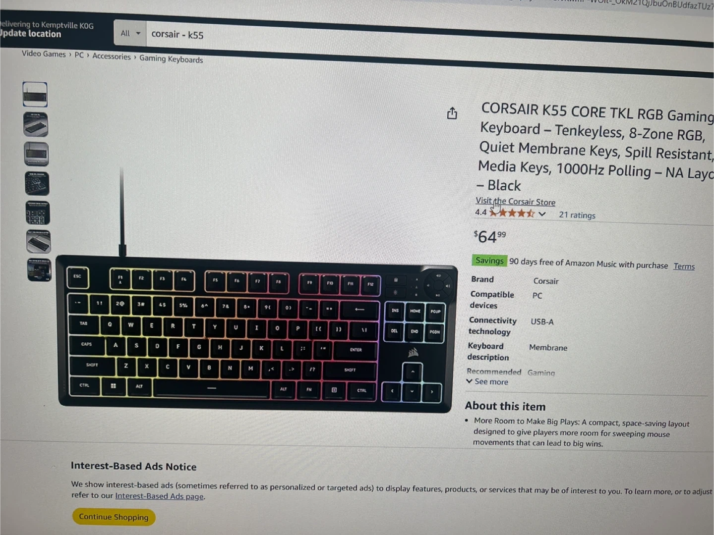 Selling a Corsair K55 Core TKL RGB gaming keyboard in black! This tenkeyless keyboard features 8-zone RGB lighting and quiet membrane keys. It's also spill-resistant and has a 1000Hz polling rate. Originally bought for $64.99