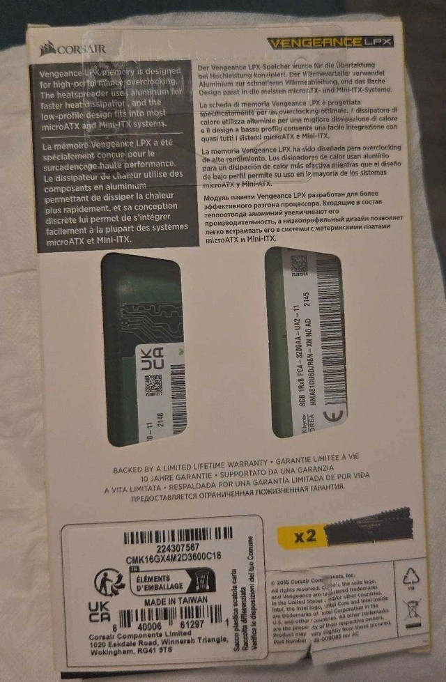 Selling a Corsair Vengeance LPX DDR4 16GB (2x8GB) 3600MHz memory kit, designed for high performance overclocking on Intel and AMD DDR4 motherboards. This used memory kit is in excellent condition and ready to boost your system's performance. Here are some specifications: * **Capacity:** 16GB (2 x 8GB) * **Memory Type:** DDR4 * **Speed:** 3600MHz * **Latency:** 18-22-22-42 * **Voltage:** 1.35V * **Compatibility:** Optimized for Intel and AMD DDR4 motherboards If the ad is up, it's available!