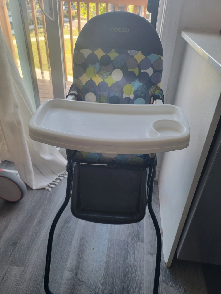Selling a Cosco high chair in good condition. It features a removable tray for easy cleaning and a comfortable seat for your little one. Perfect for meal times!