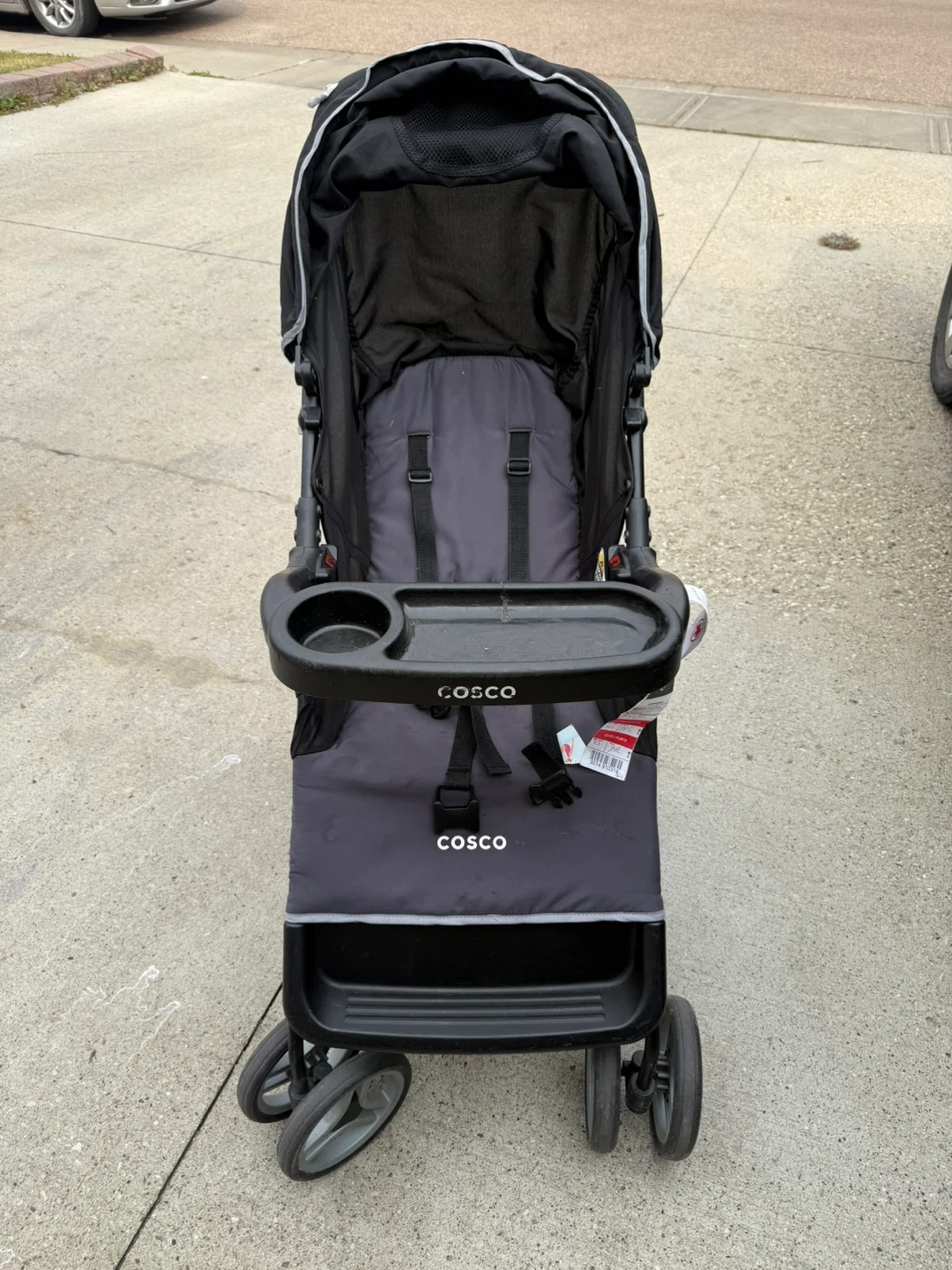 Selling a Cosco stroller in great condition! It's black and grey, and perfect for taking your little one on walks. It has a tray for snacks and drinks, and a comfortable seat for your child. It's lightweight and easy to fold up for storage or transport. Message me if interested!