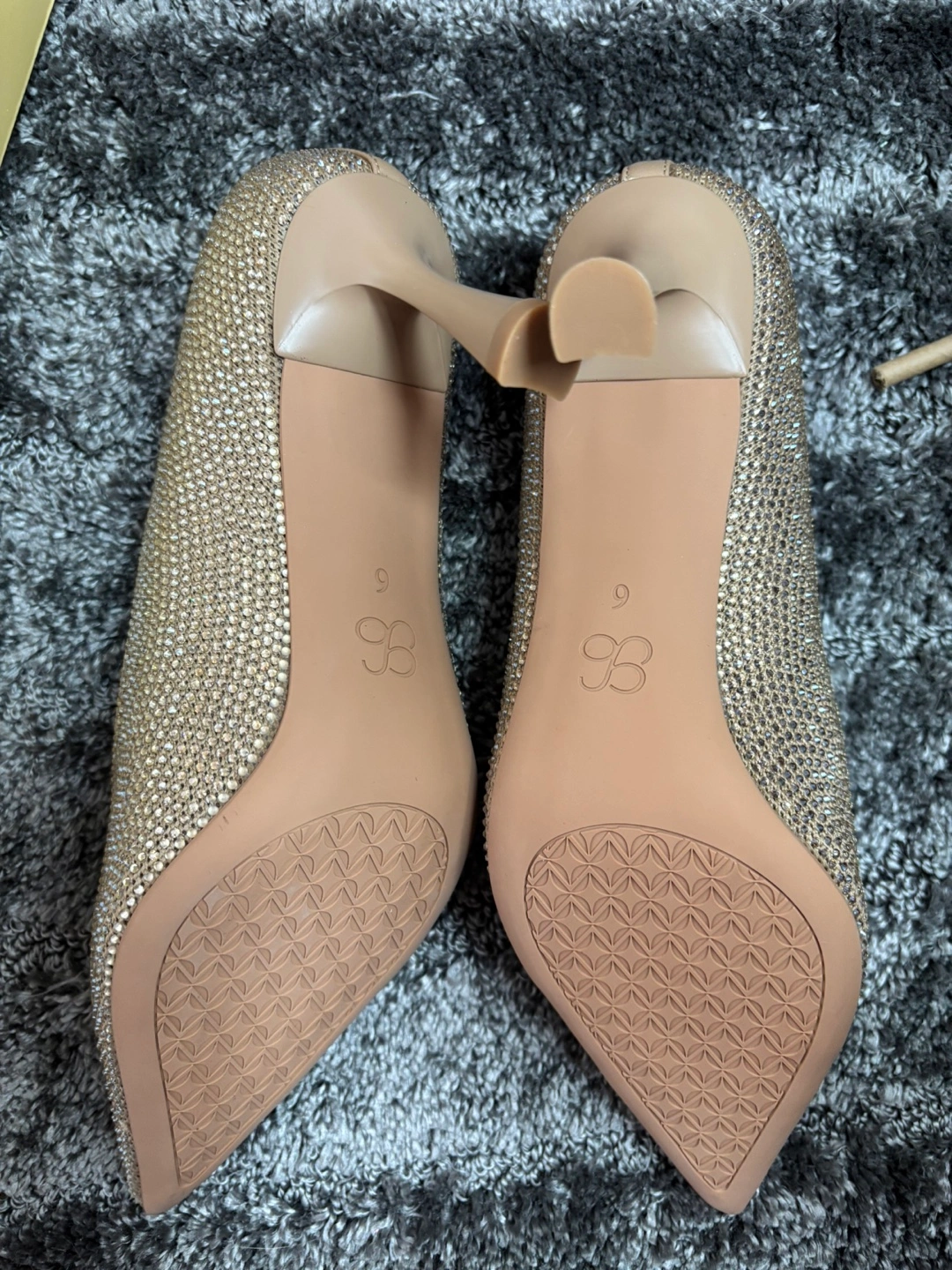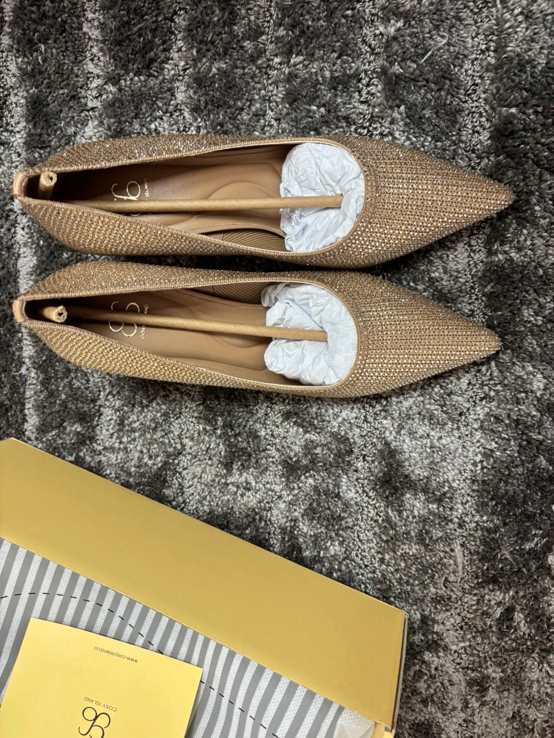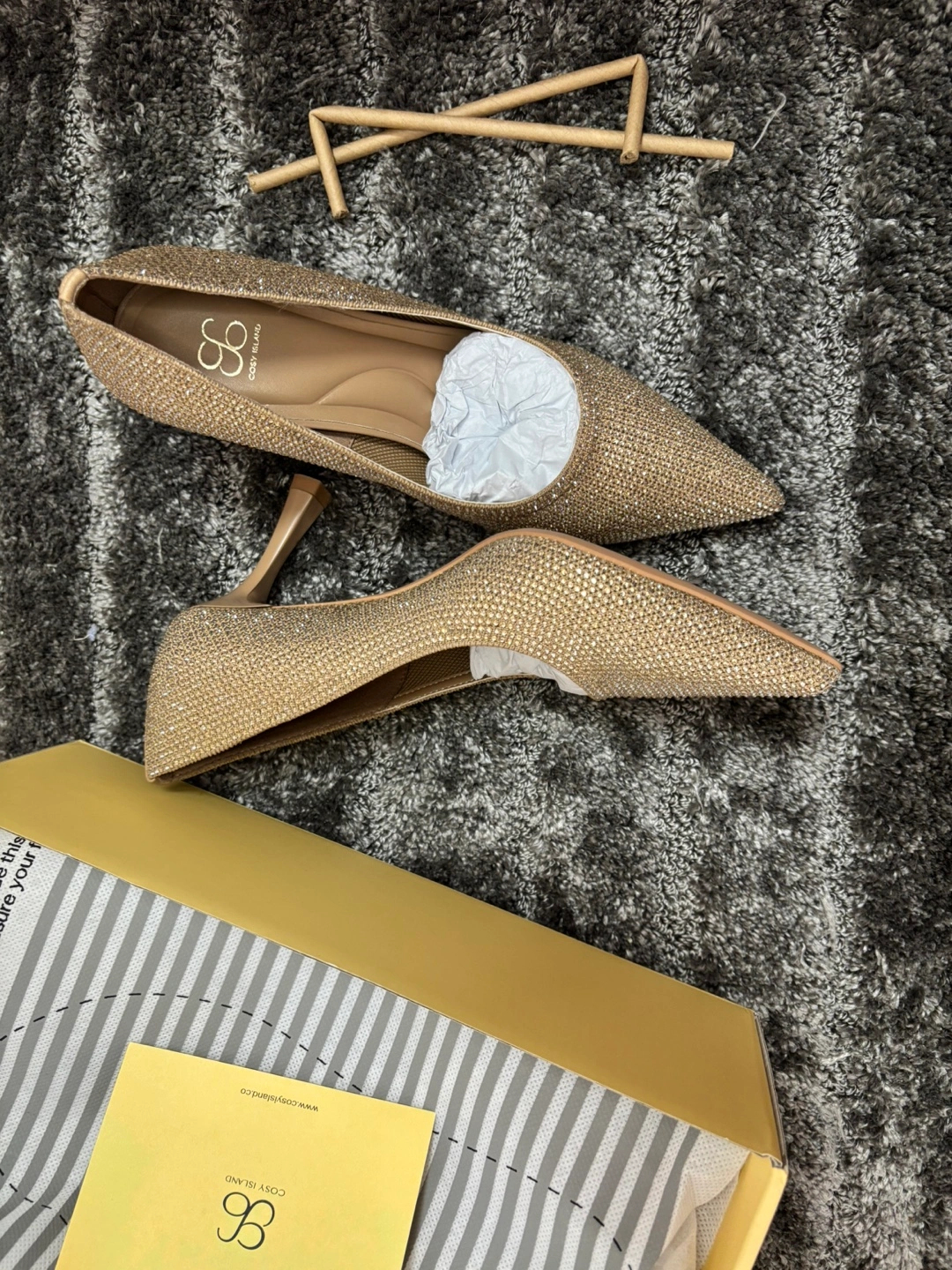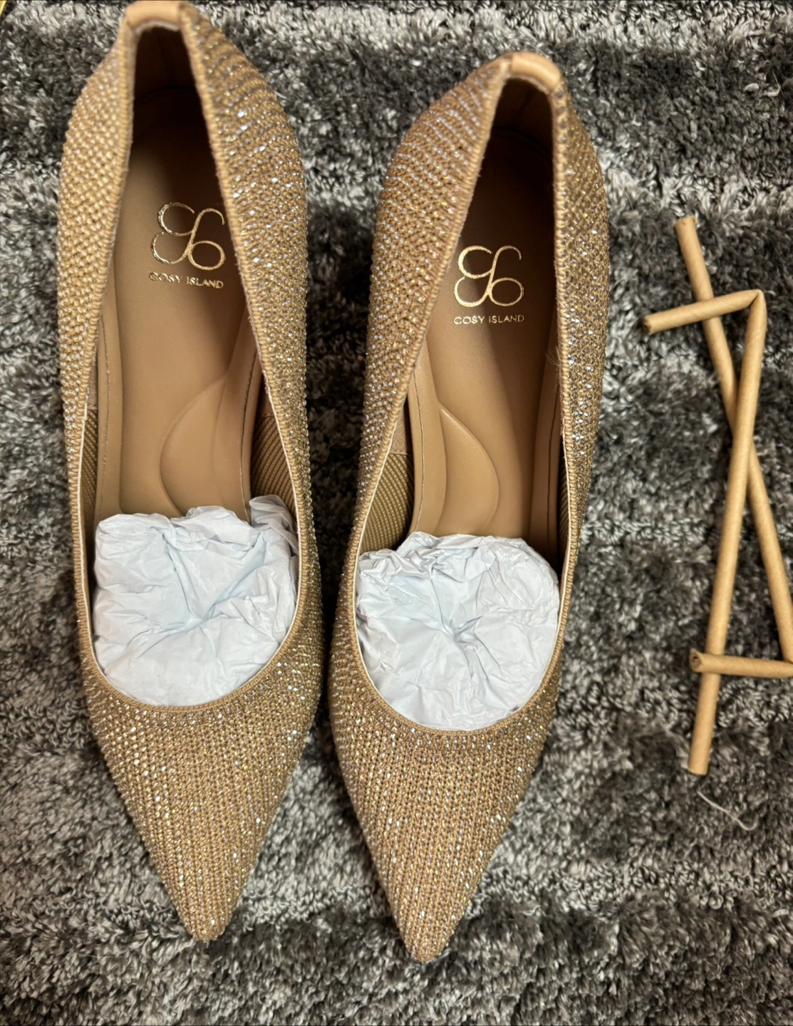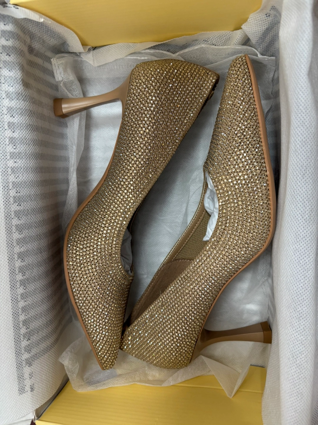 Gorgeous gold heels. Pointed-toe style. A comfortable heel for your feet to make you feel relaxed and stylish. Brand new in the original box, they have never been worn.