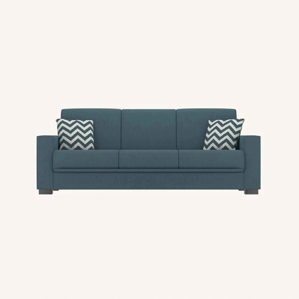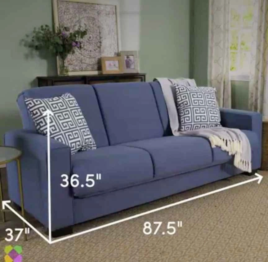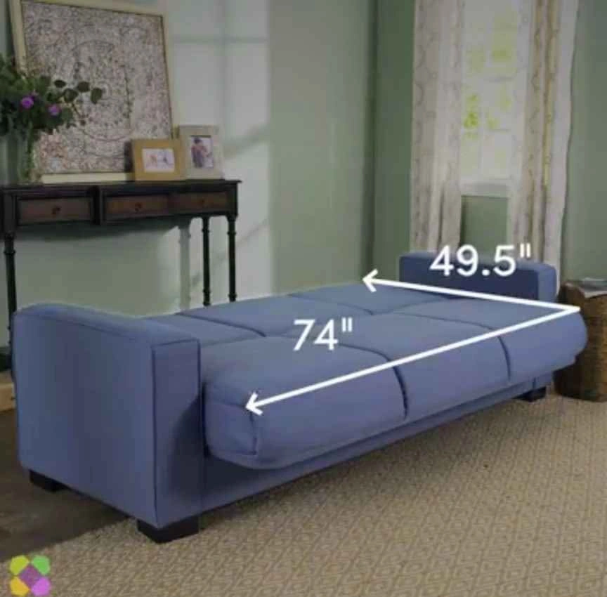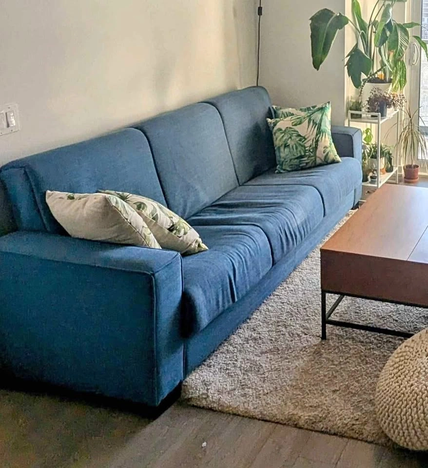 Looking to rehome this comfy blue three-seater sofa couch! Easily sits 4. It's in good condition and ready for a new living room. Perfect for lounging and sleeping an additional 2 persons. Folds out to about a size of a double bed. +3 cushions (not pictured) Originally bought from Wayfair. Width: 74 inches, Height: 36.5 inches, Depth: 37 inches Can be dismantled. No damages. Pick up only King and Parliament St