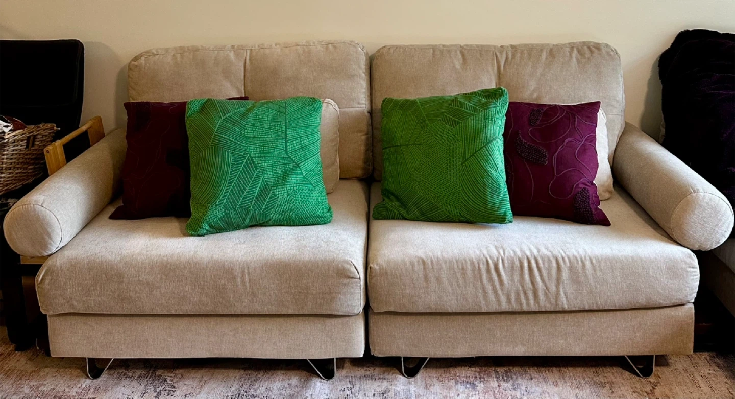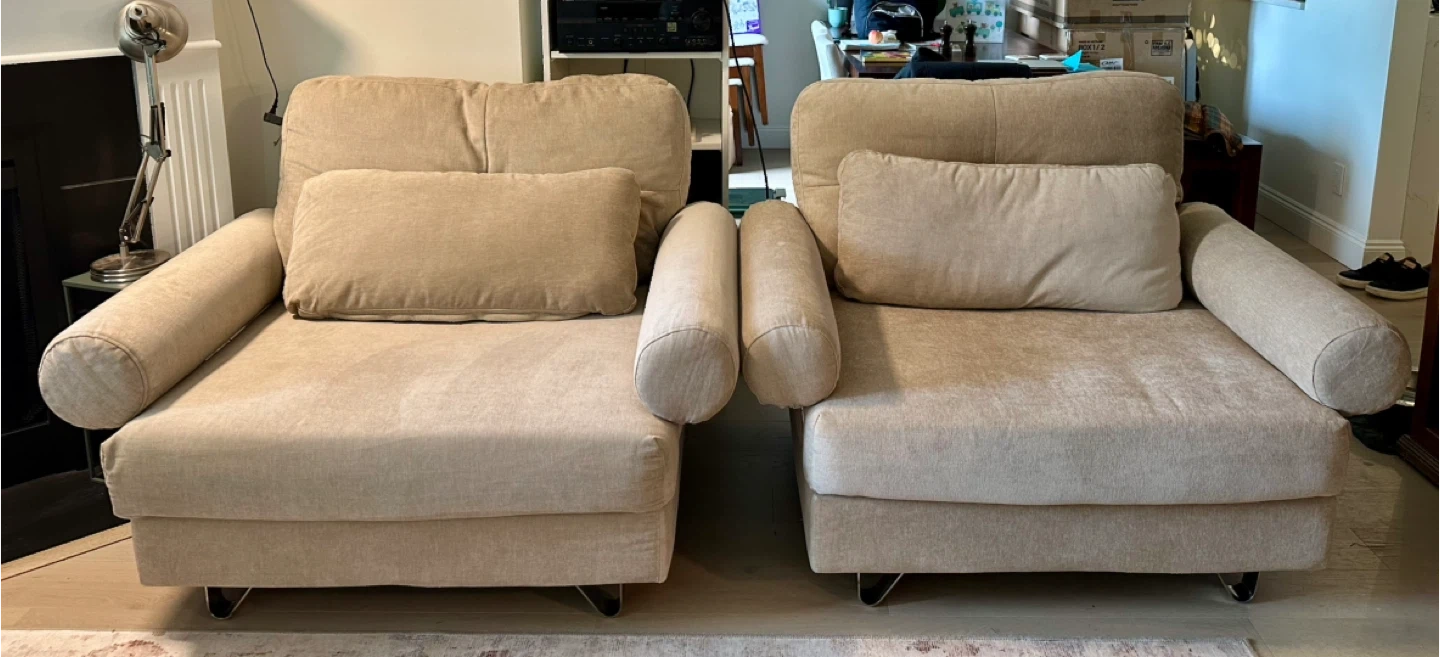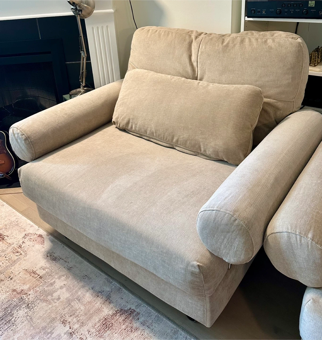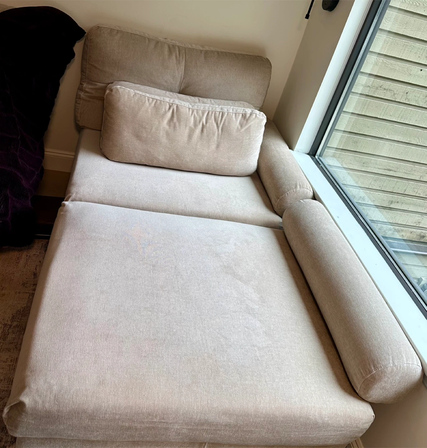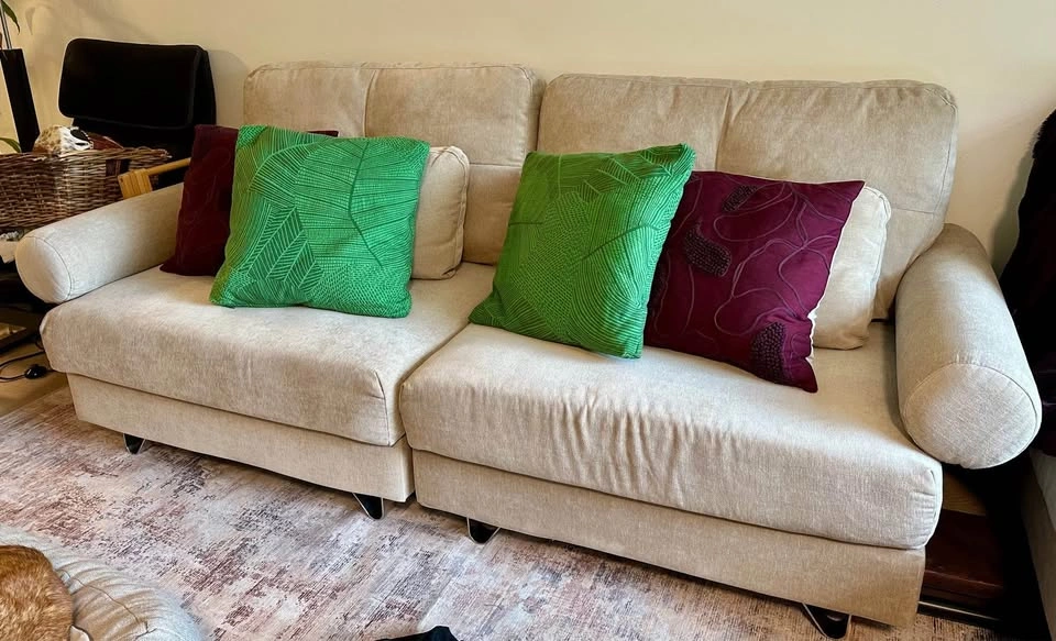 We have an excellent condition, deep and comfortable two-cushion couch which sits up to four people. We had it in our study/office for 6 months so it didn’t just much use, but with our little one on the way, we’re selling it to turn the room into his nursery. All fabric is removable and machine washable, and it can be reconfigured into two arm chairs (we have the extra arms) or a chaise lounge. The cushions lift off to reveal a good amount of storage space below for blankets etc, especially great if you plan to use it as a guest bed since it’s approximately the size of a twin mattress).