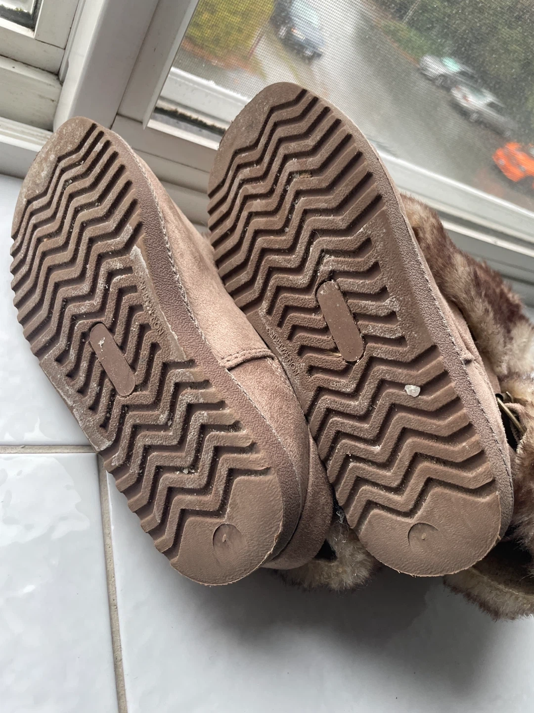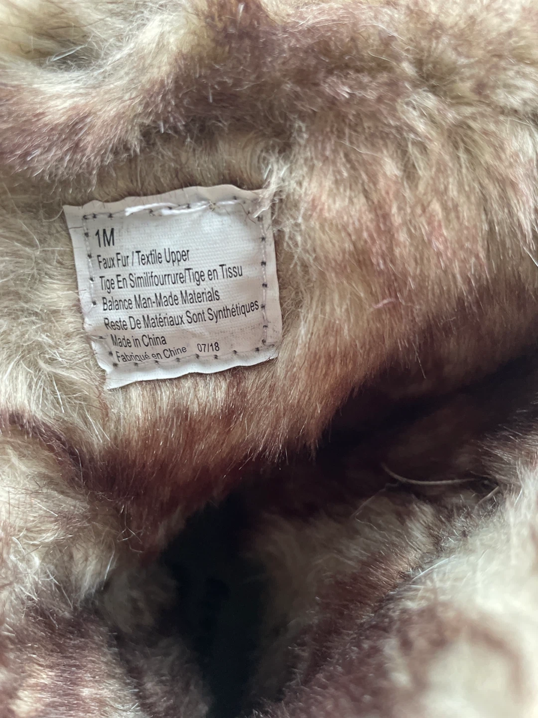 Keep your feet warm this winter with these Cougar faux fur boots! They are a size 1M and have a textile upper with man-made materials on the balance of the shoe. Perfect for those cold Canadian days!
