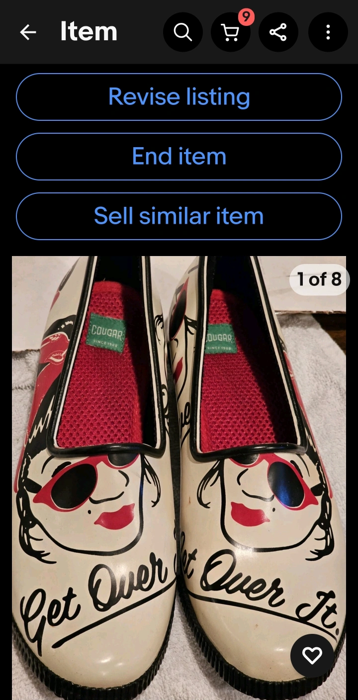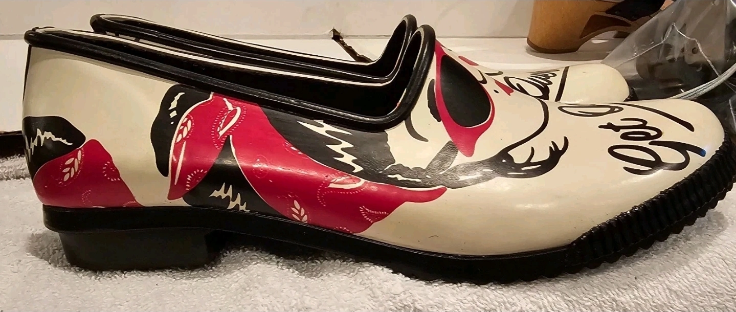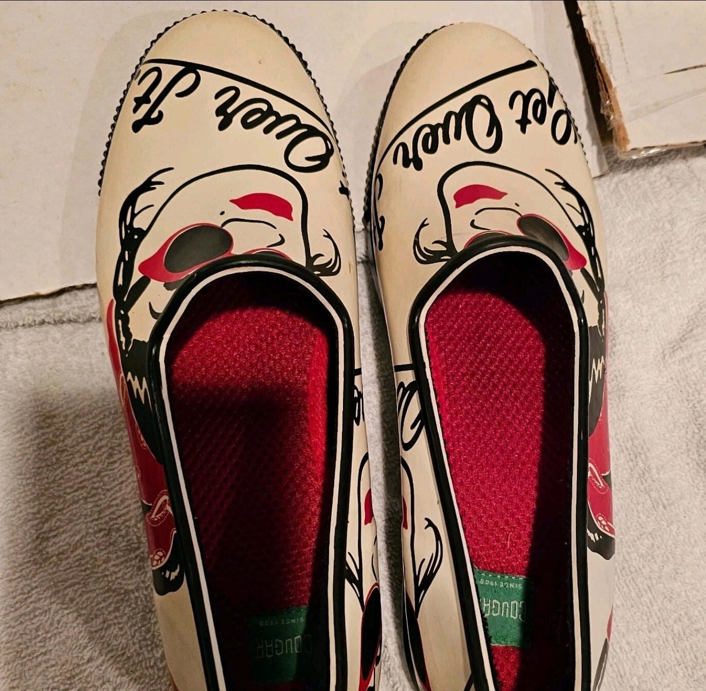 These Cougar waterproof shoes are super cute and ready for anything! They feature a fun "Get Over It" design and are a women's size 7. The soles are made of hand-crafted rubber, so they're durable and ready for anything Cougar Women's Get Over It Rubber Shoes Size 10, gently used. These slip-on boots are perfect for rainy days or gardening. The multicolored rubber upper material is easy to clean and adds a fun pop of color to any outfit. The vintage style and "Get Over It" character make these boots a unique addition to your shoe collection. The size 10 fit is true to size and comfortable for all-day wear. Don't miss out on this pre-owned gem from Cougar.