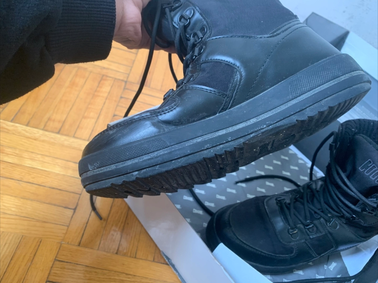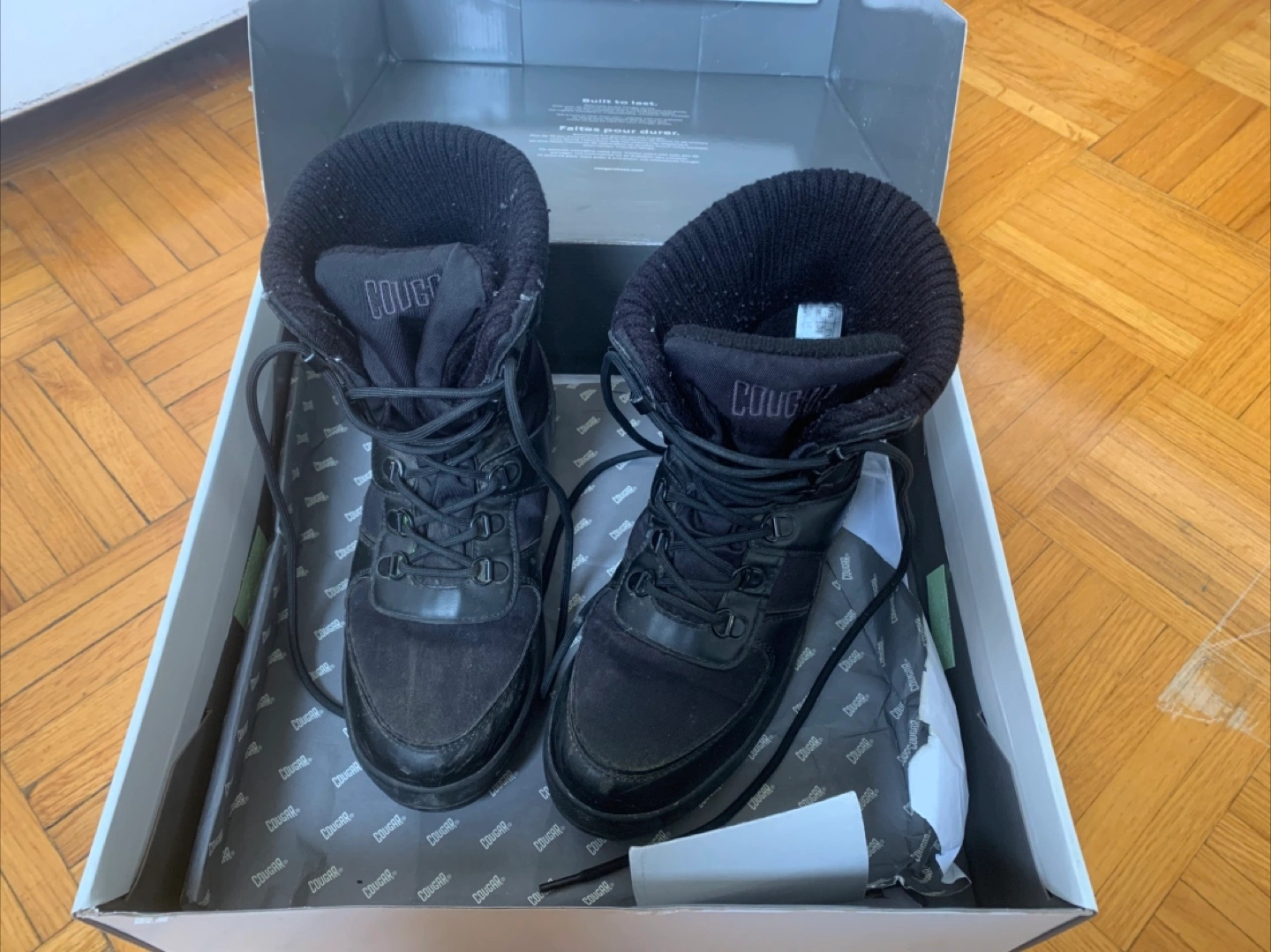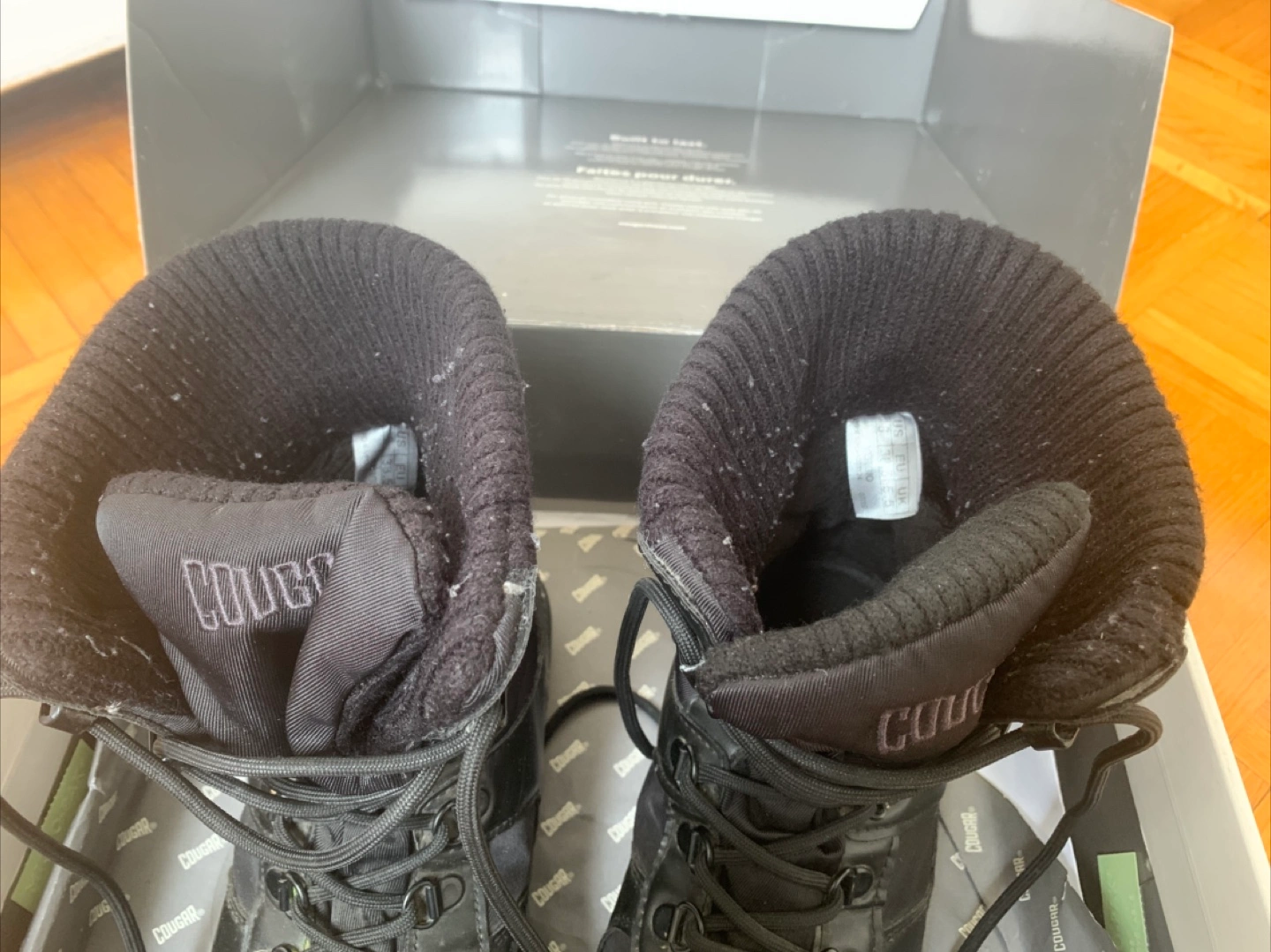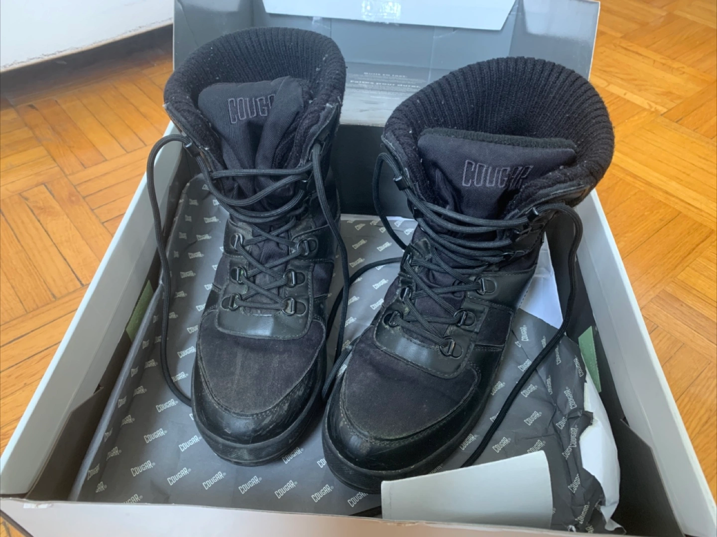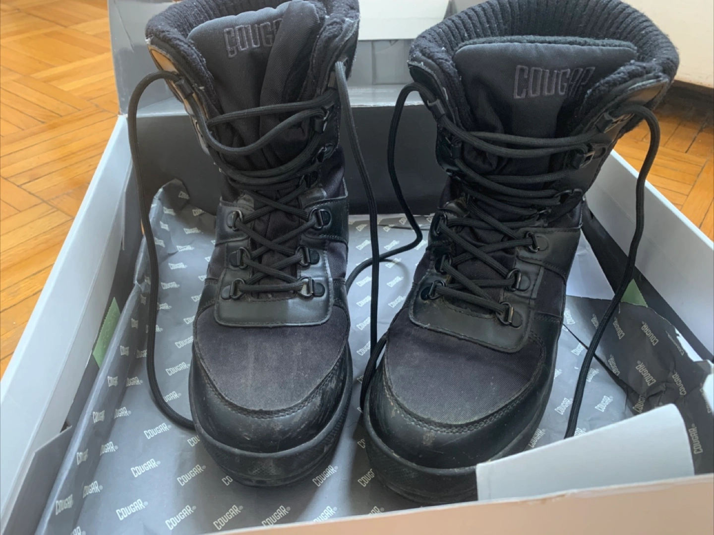Cougar Vergio lace-up snow boots. Black all over. Waterproof. Faux-fur lined. Size: US 8 / UK 5.5. Tractioned anti-slip soles. Rated to -30c -22f . Used, still in great condition and super warm for winter.