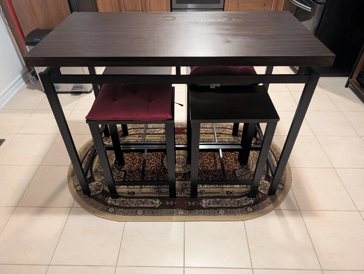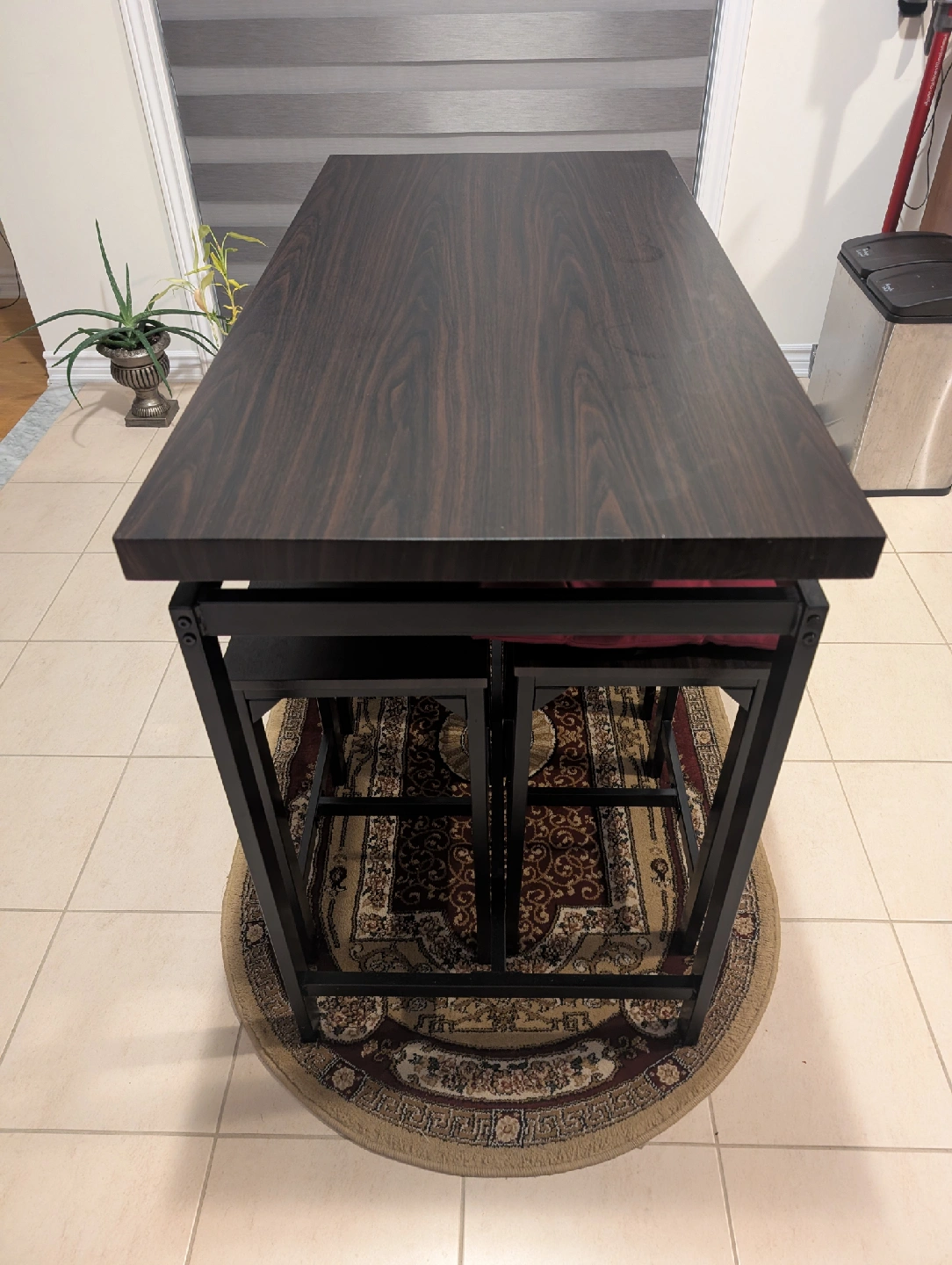Selling a counter height dining table that comes with four matching stools. It's a great set for a smaller space or kitchen nook. The table has a dark wood-look top and a sturdy metal frame. The stools have comfy cushioned seats. Perfect for casual dining or entertaining!