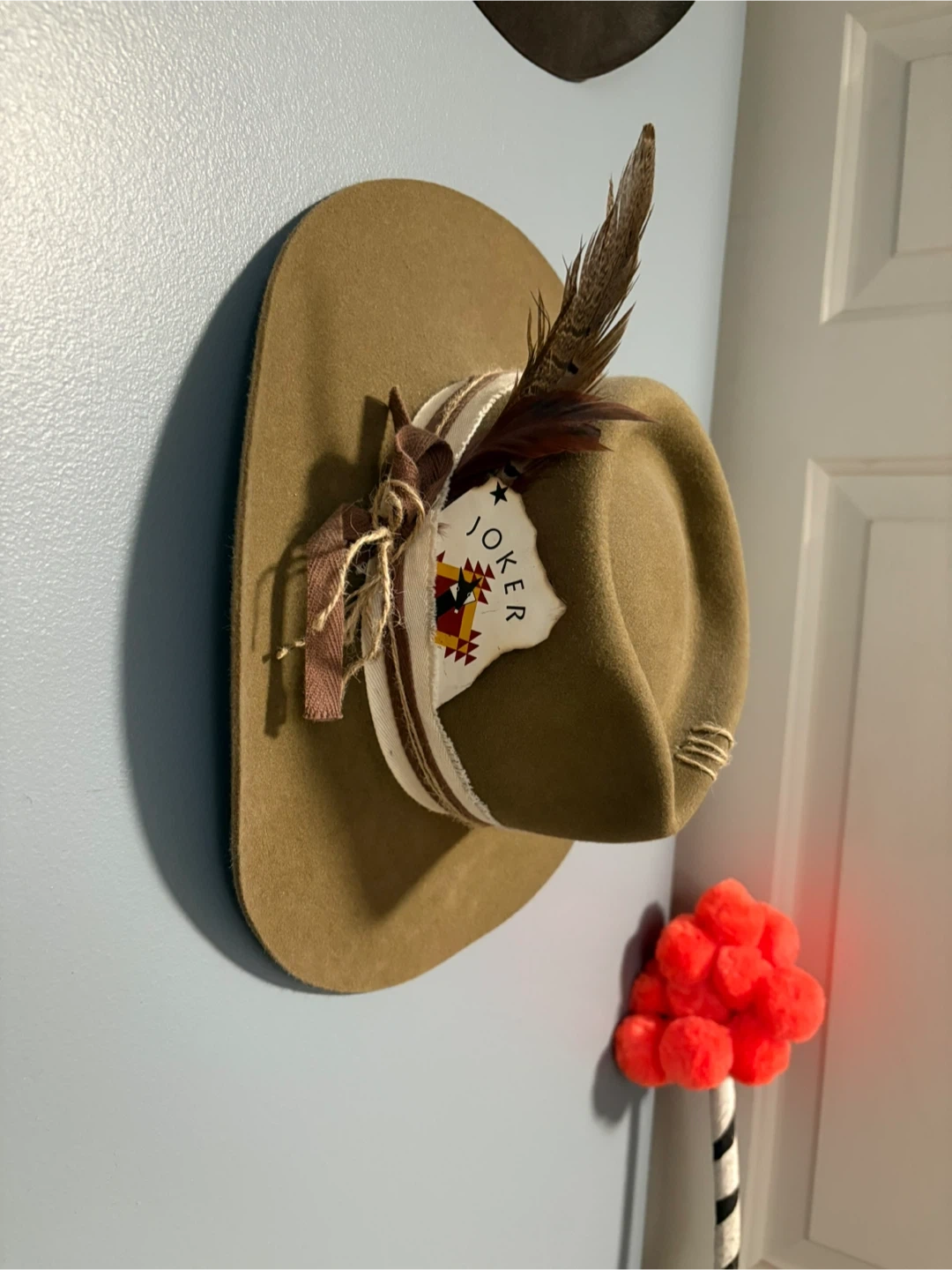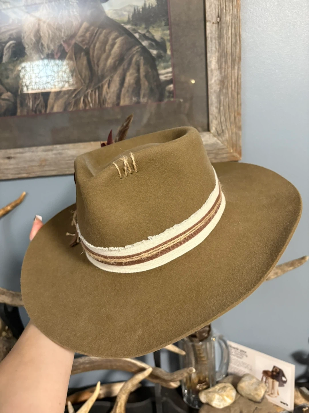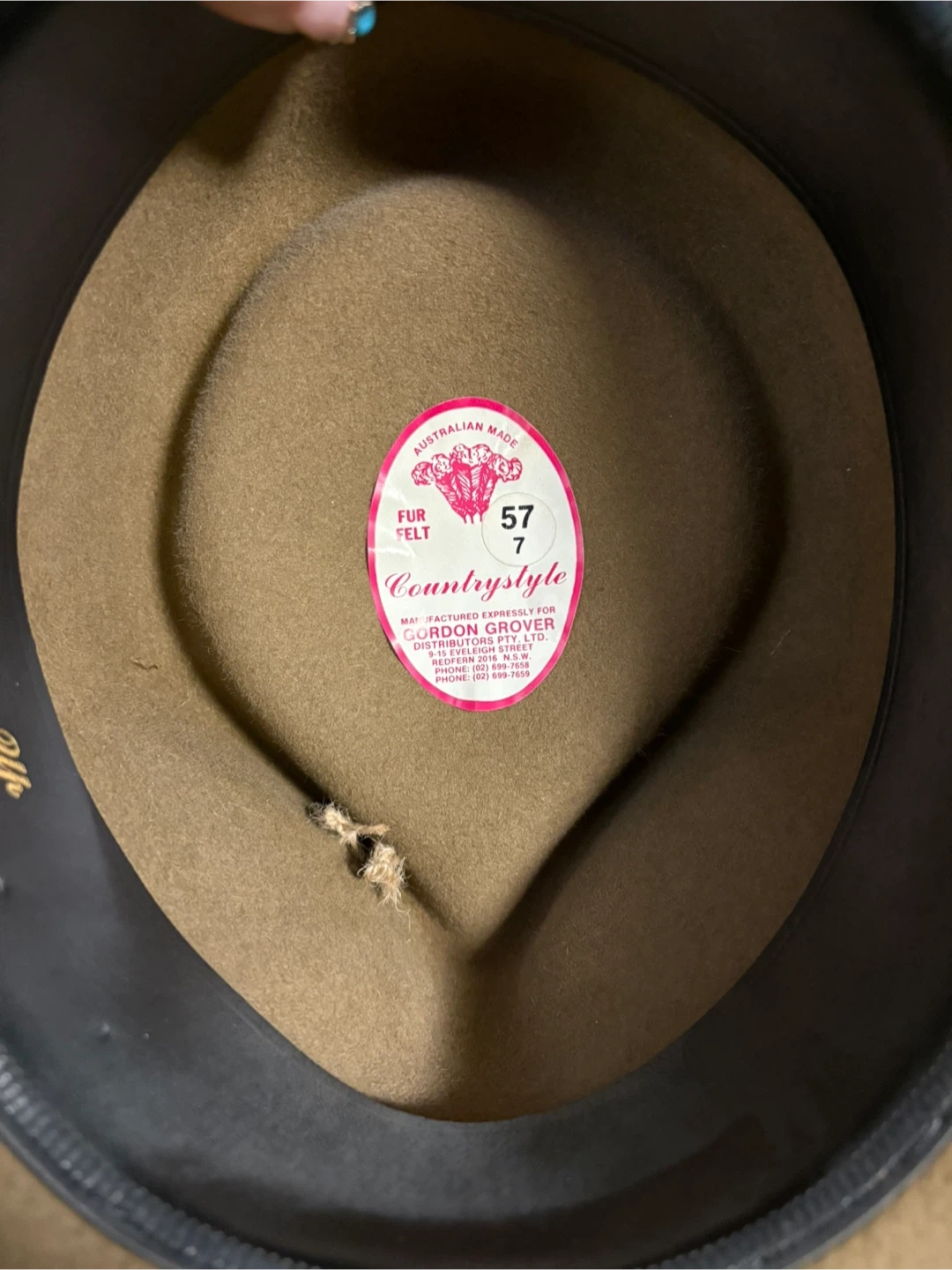 Country Style fur felt hat in size 7. This hat has a unique style with a feather and ribbon accent. It's in good condition and ready for a new home