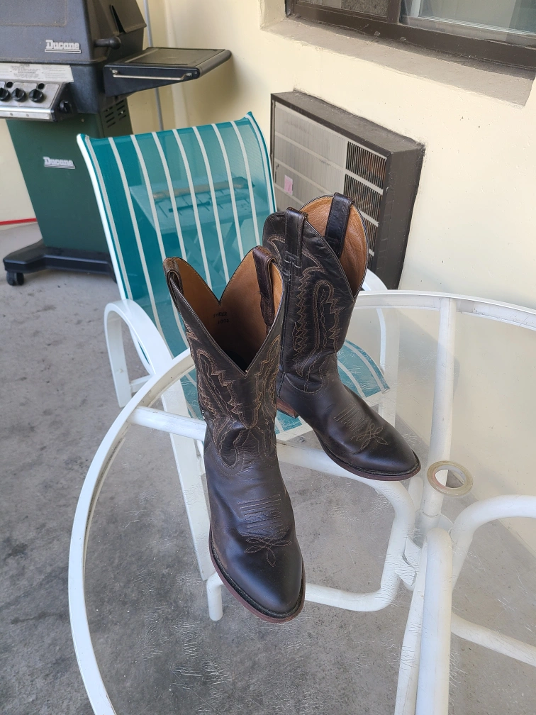 Selling a pair of cowboy boots. They are in good condition and have some wear and tear. Perfect for a country look!