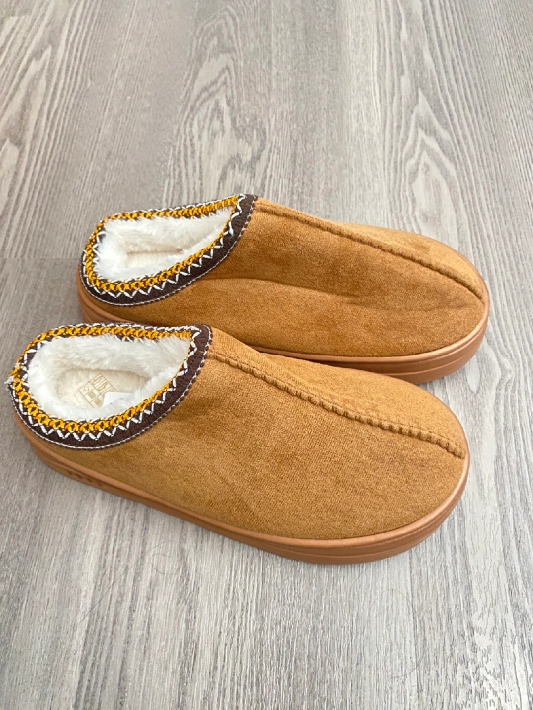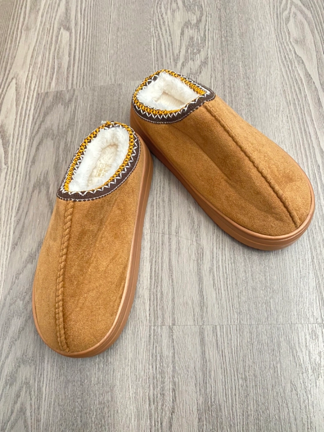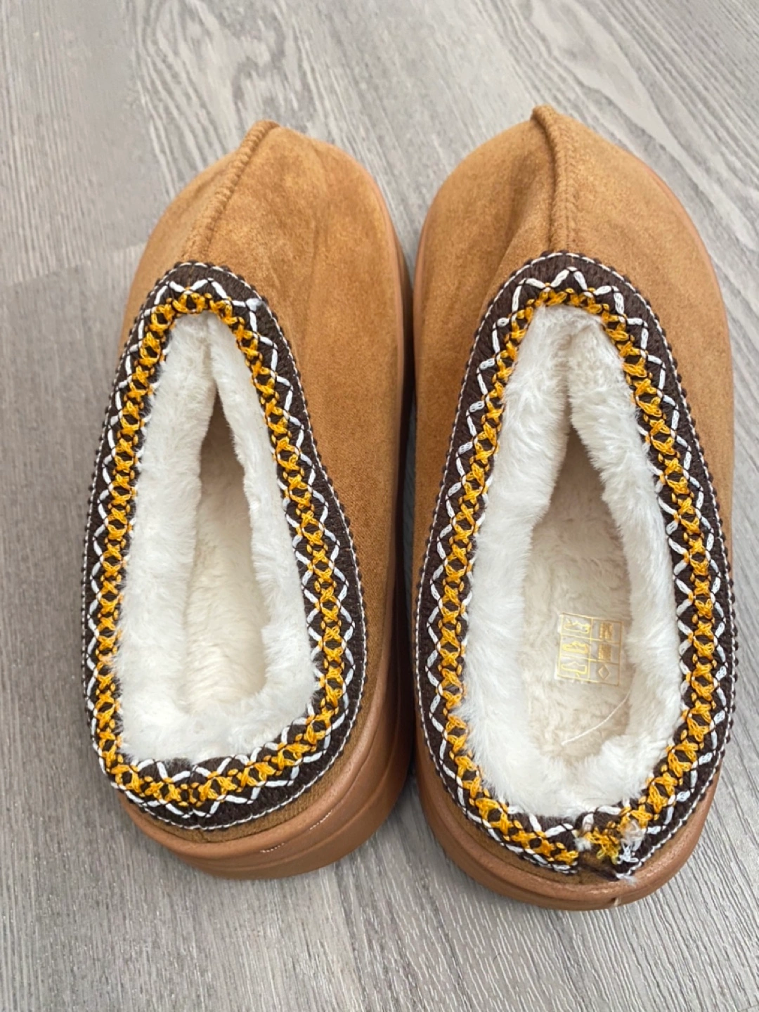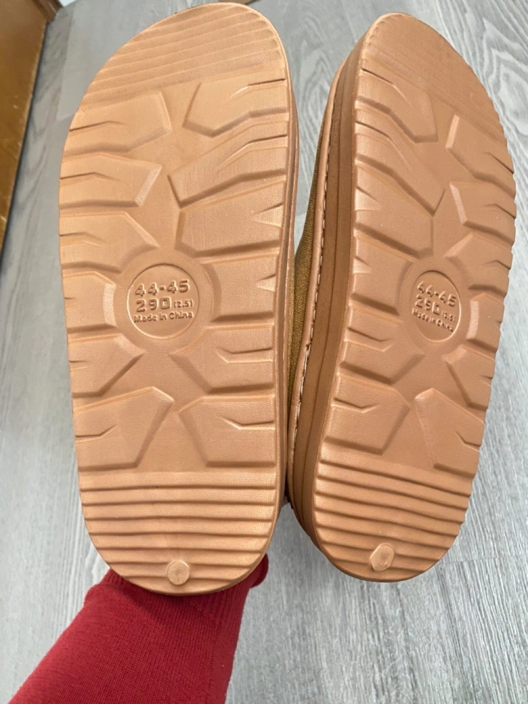 Warm and comfortable slippers. Brown suede-like material. Soft fluffy interior. Rubber sole. Size 44-45.