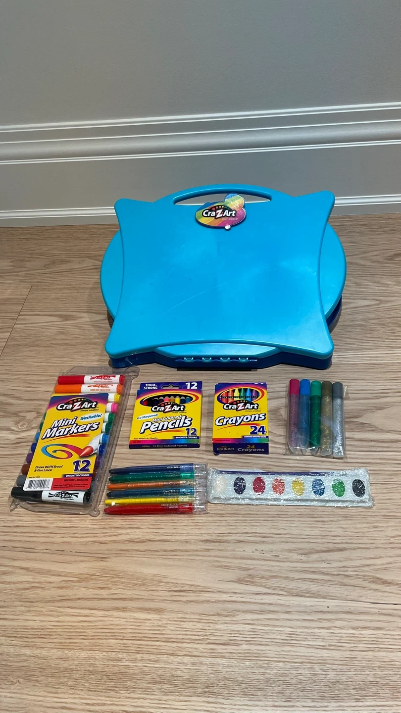 Selling a Cra-Z-Art art supplies set! Includes markers, pencils, crayons, glitter glue sticks and watercolours, all in a handy carrying case! Perfect for young artists!
