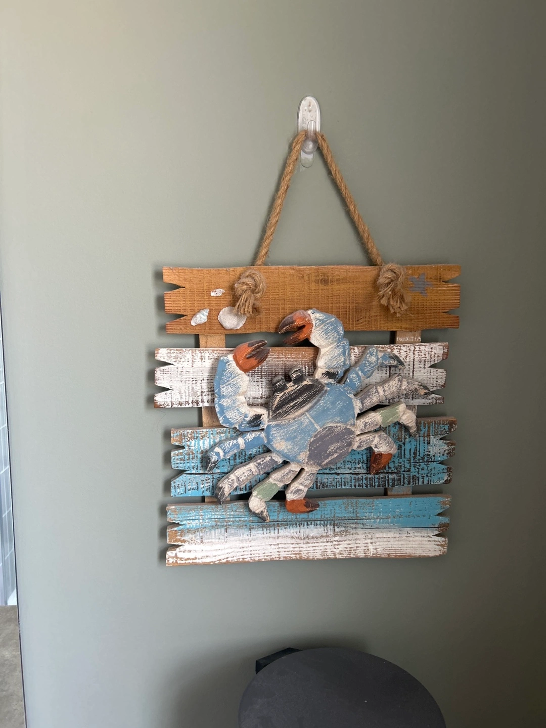 Cute crab wall decor. It's made of wood and has a rustic, beachy vibe. Perfect for adding a touch of coastal charm to your home!