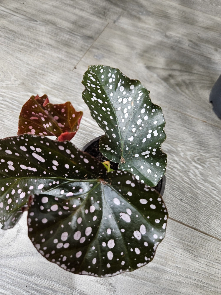 Selling a cracklin Rosie begonia plant in a pot! It has unique foliage with dark green leaves and pink polka dots. It's a beautiful addition to any indoor space!