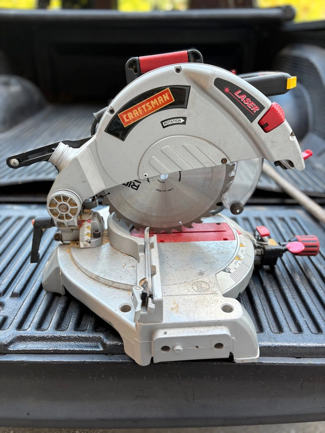 Selling a used Craftsman 15 Amp 10-in Compound Miter Saw with Laser Trac that's ready to tackle your projects. This saw is perfect for making accurate crosscuts and miters. Here are some details: * 15 Amp motor for powerful cutting. * 10-inch blade. * Miter adjustment range of 0 to 45 degrees left and right. * Compound cutting capability for bevel cuts. This saw is looking for a new home where it can continue to be put to good use. I think $100 is a fair price. very good condition If you're seeing this ad, the miter saw is still available.