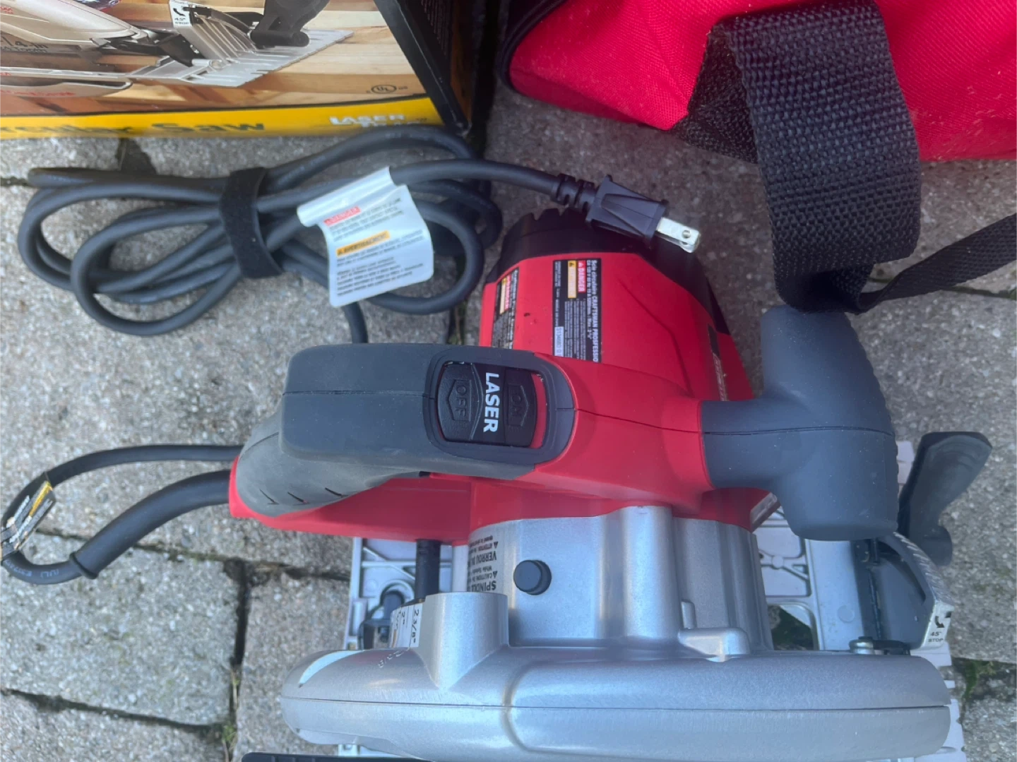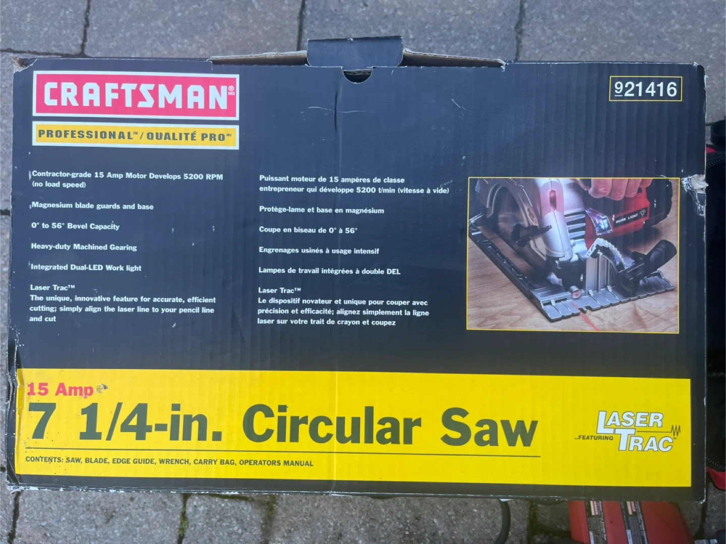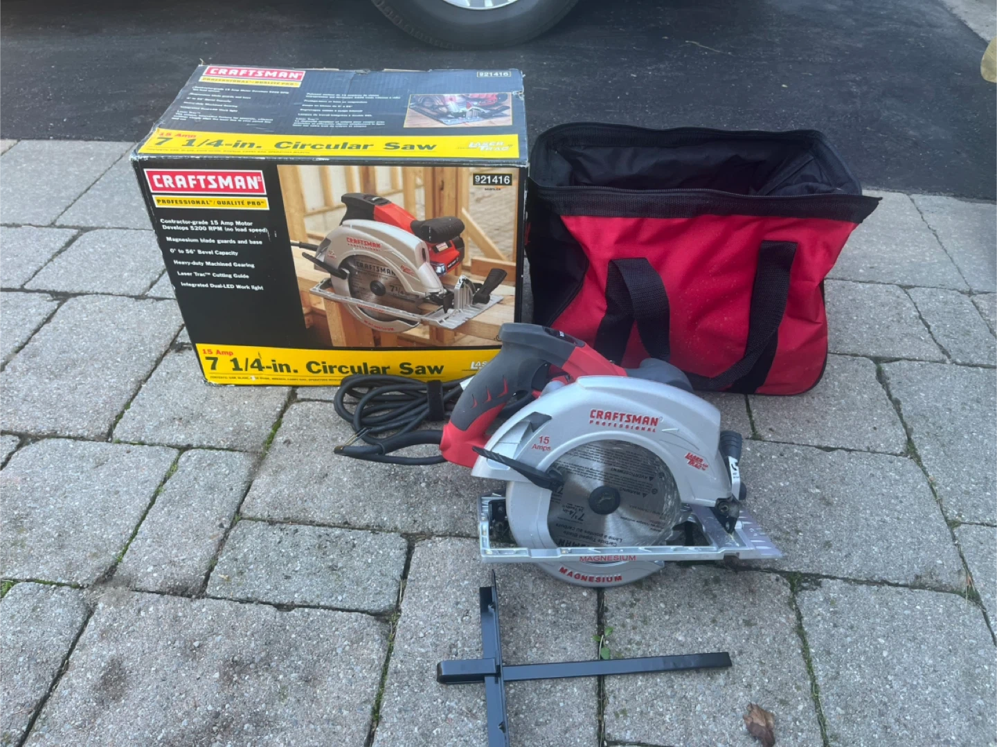 Selling a Craftsman 7 1/4-in. circular saw. It features Laser Trac for accurate cuts. - 15 Amp motor - Magnesium blade guards and base - 0° to 56° Bevel capacity - Integrated Dual-LED work light Comes with the saw, blade, edge guide, wrench, carry bag, and operator's manual