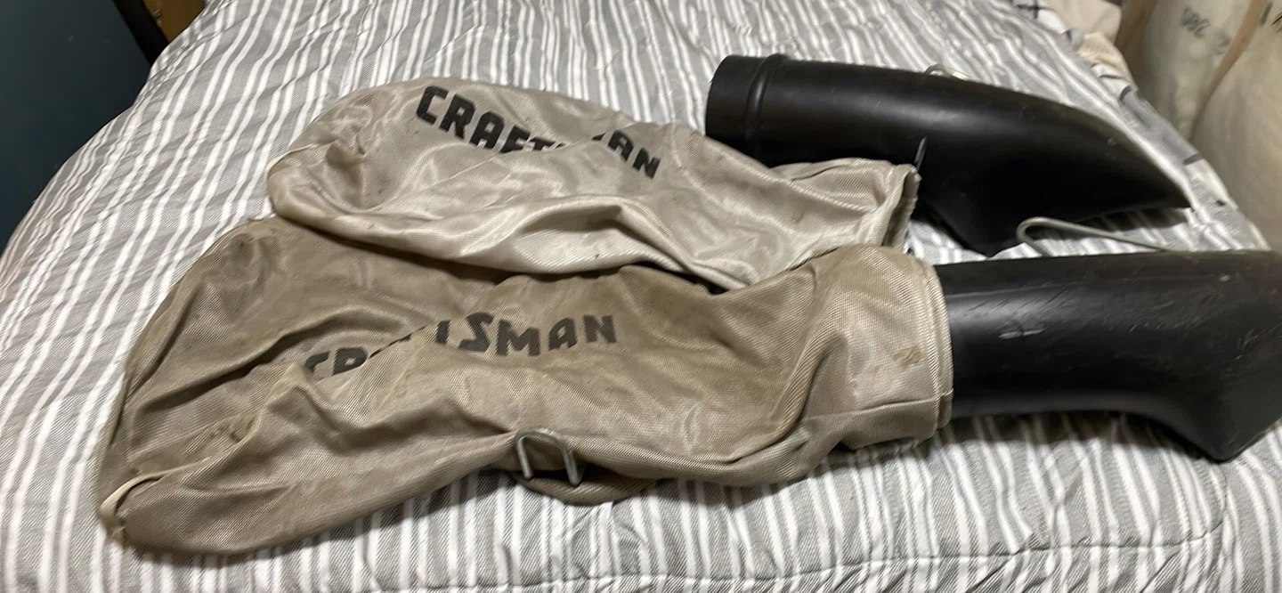 Craftsman blower vac attachment set in used condition. Includes two bags and the attachment pieces as shown in the photos. Perfect for leaf cleanup! The opening is about 10 inches long x 5 inches wide. For commercial mowers. Accepting cash and e-transfer. Front door pick up.