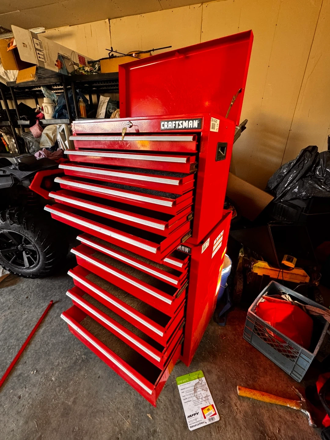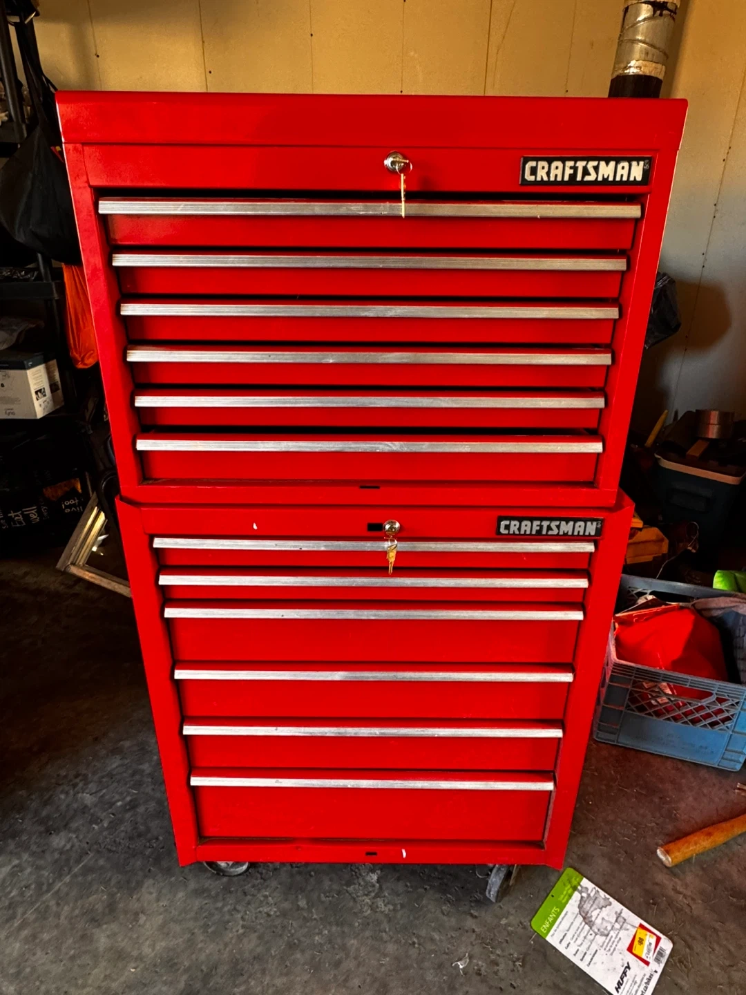 Selling a Craftsman tool chest in red! This is a great storage solution for any mechanic or DIY enthusiast. It has many drawers for organizing all your tools and equipment. The chest is in good condition and ready to use! Dimensions Heavy duty Craftsman tool chest in excellent condition, comes with keys . Dimensions Length 51 inches, width 27 inches, depth for top one 12 inches, bottom one 17 inches