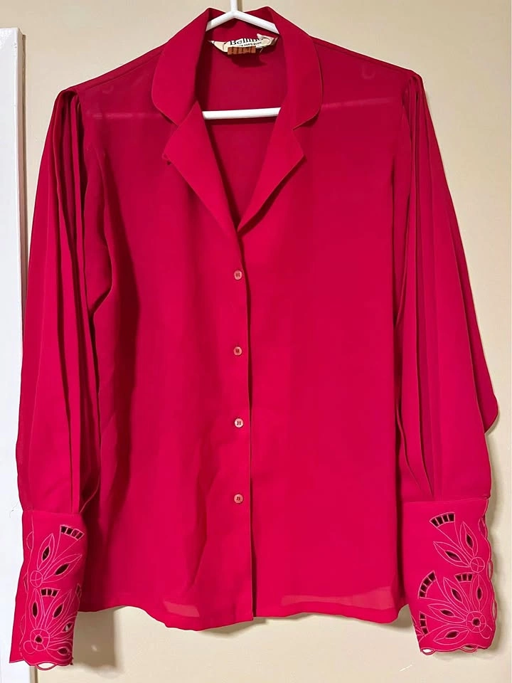 Cranberry Red Blouse with pleated sleeves and beautifully detailed cuffs that snap closed. Size M. Let me know if you're interested!