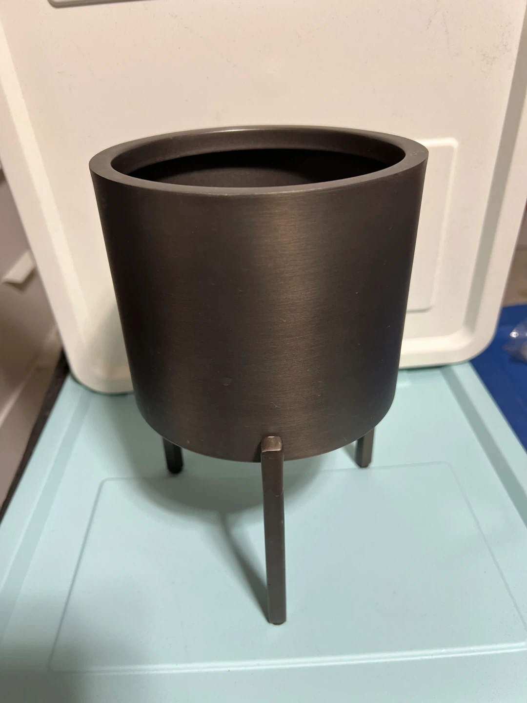 Selling a lovely bronze metal plant pot with a stand from Crate Barrel. It's in great condition and ready to add a touch of modern elegance to your home. The pot is about 6 inches in diameter.