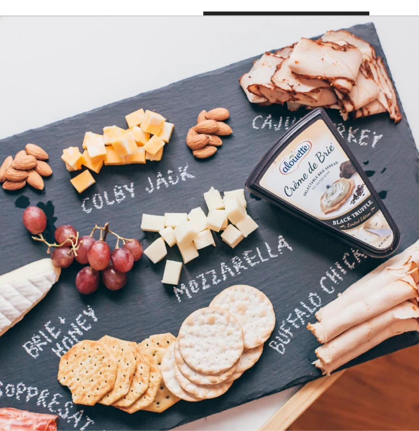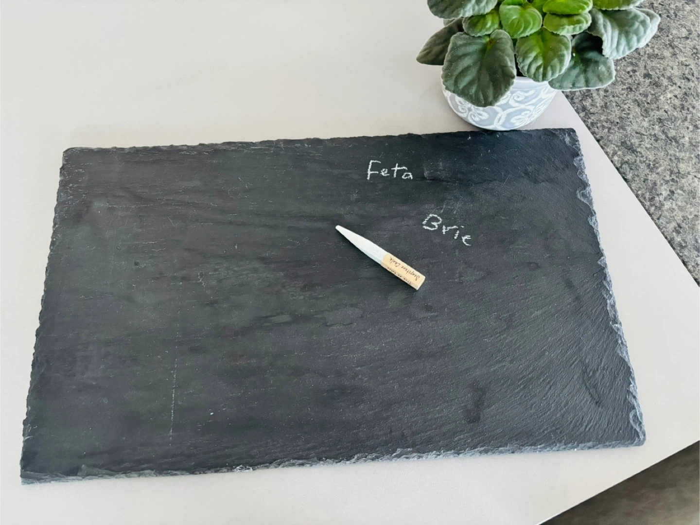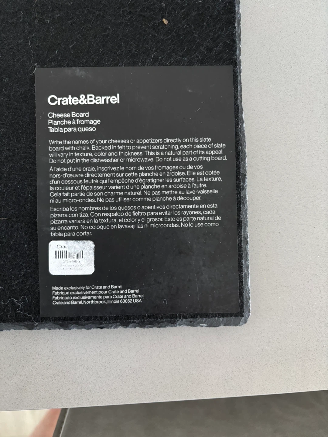 Selling a Crate & Barrel cheese board! It's a beautiful slate board perfect for serving cheeses and appetizers. You can write the names of your cheeses or appetizers directly on this slate board with chalk. It's made exclusively for Crate and Barrel