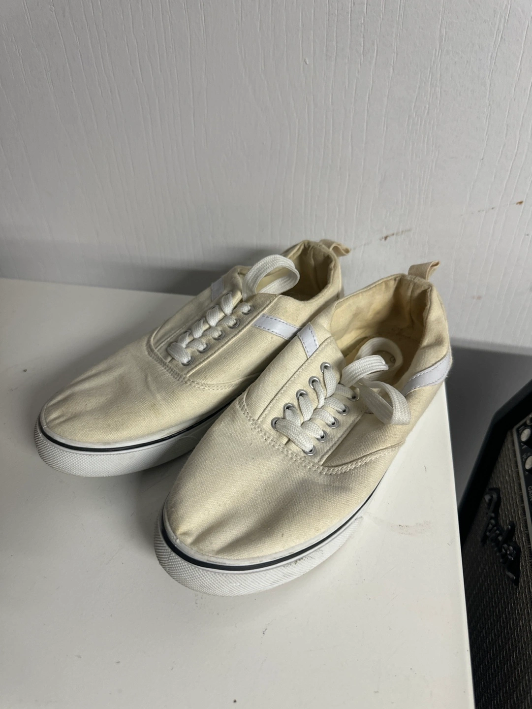 Pair of off-white canvas shoes. Lace-up closure. Minimalist design. Good condition.