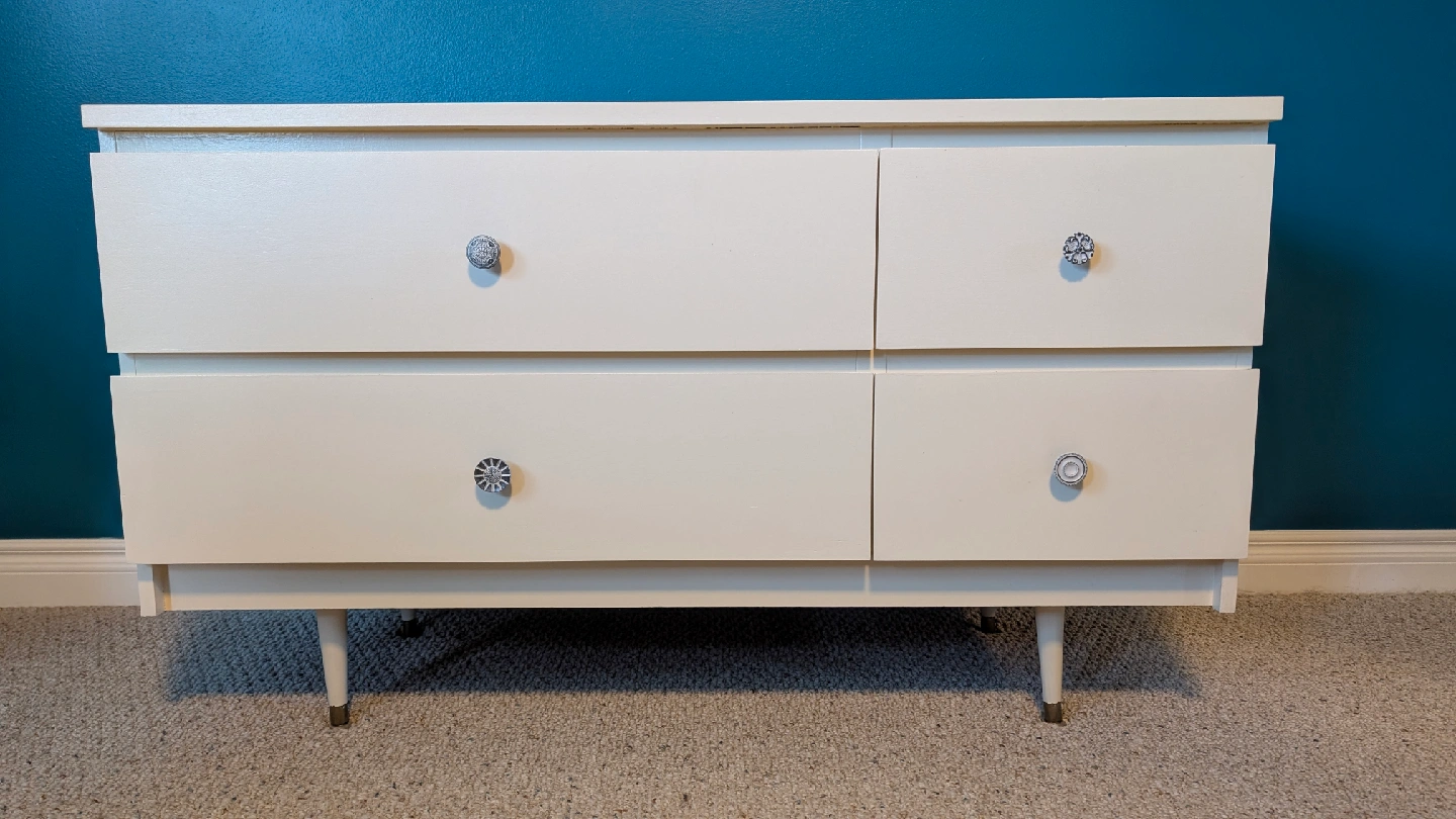 This four-drawer dresser offers ample storage with a touch of mid-century modern flair. Although it's a used piece, it's sturdy and ready to organize your wardrobe. The unique hardware adds a bit of sparkle, making it a functional and stylish addition to any bedroom. * Four spacious drawers * Mid-century modern style * Unique decorative hardware