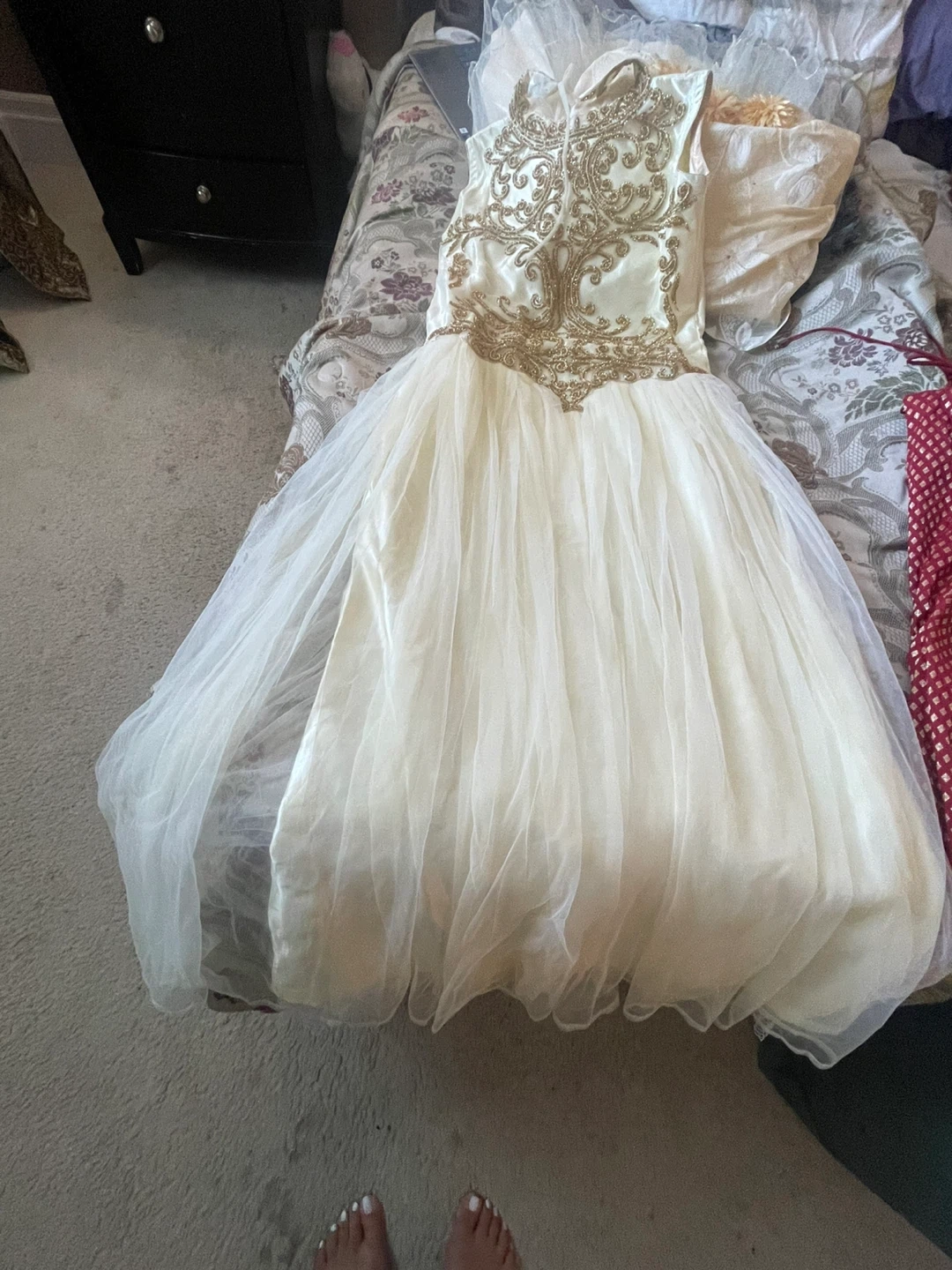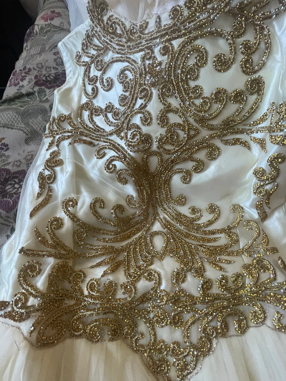 Beautiful cream-coloured dress with gold embellishments! The dress has a lovely design on the bodice and a flowing skirt. Perfect for a special occasion!
