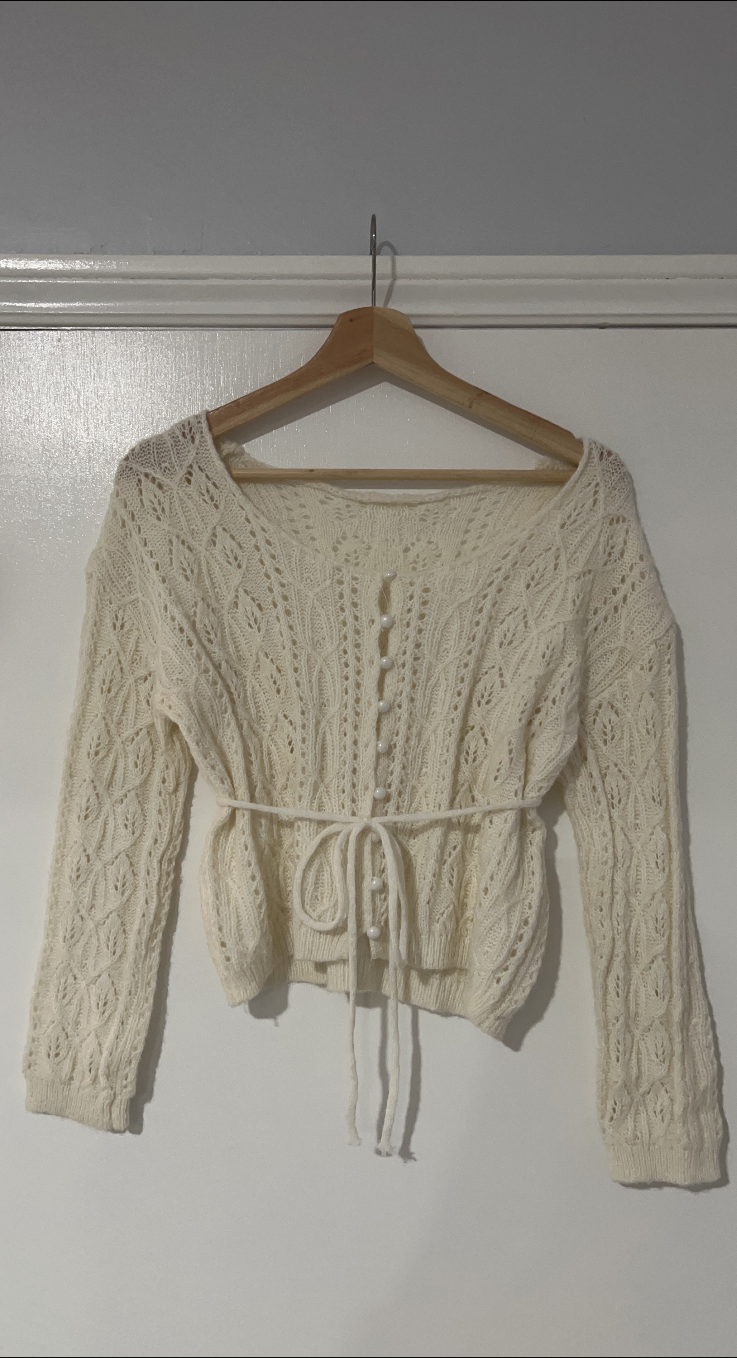 Selling a cute cream-coloured knit cardigan! It has a delicate knit pattern and a tie at the waist. Perfect for layering or wearing on its own. It's in great condition and ready for a new home