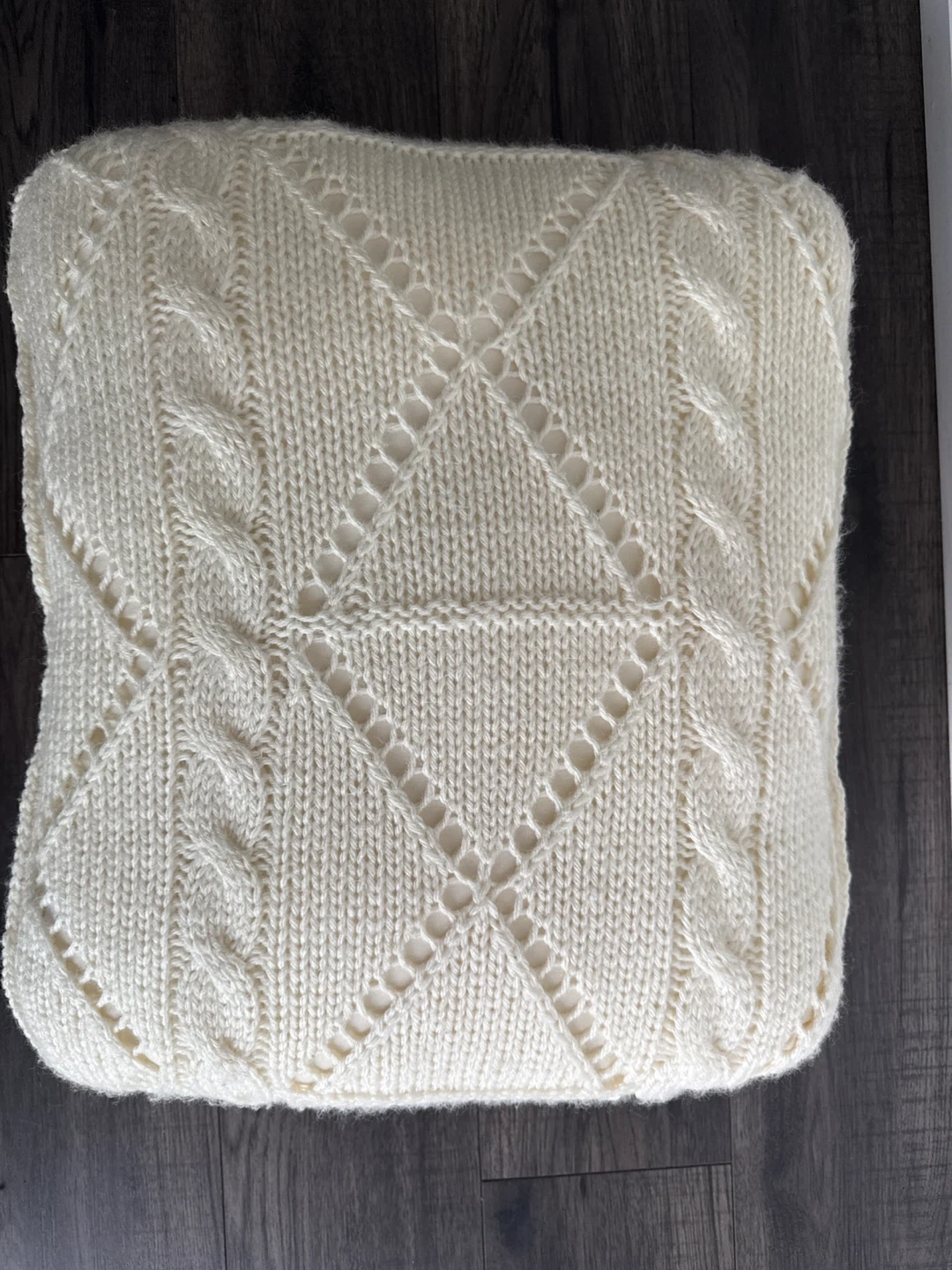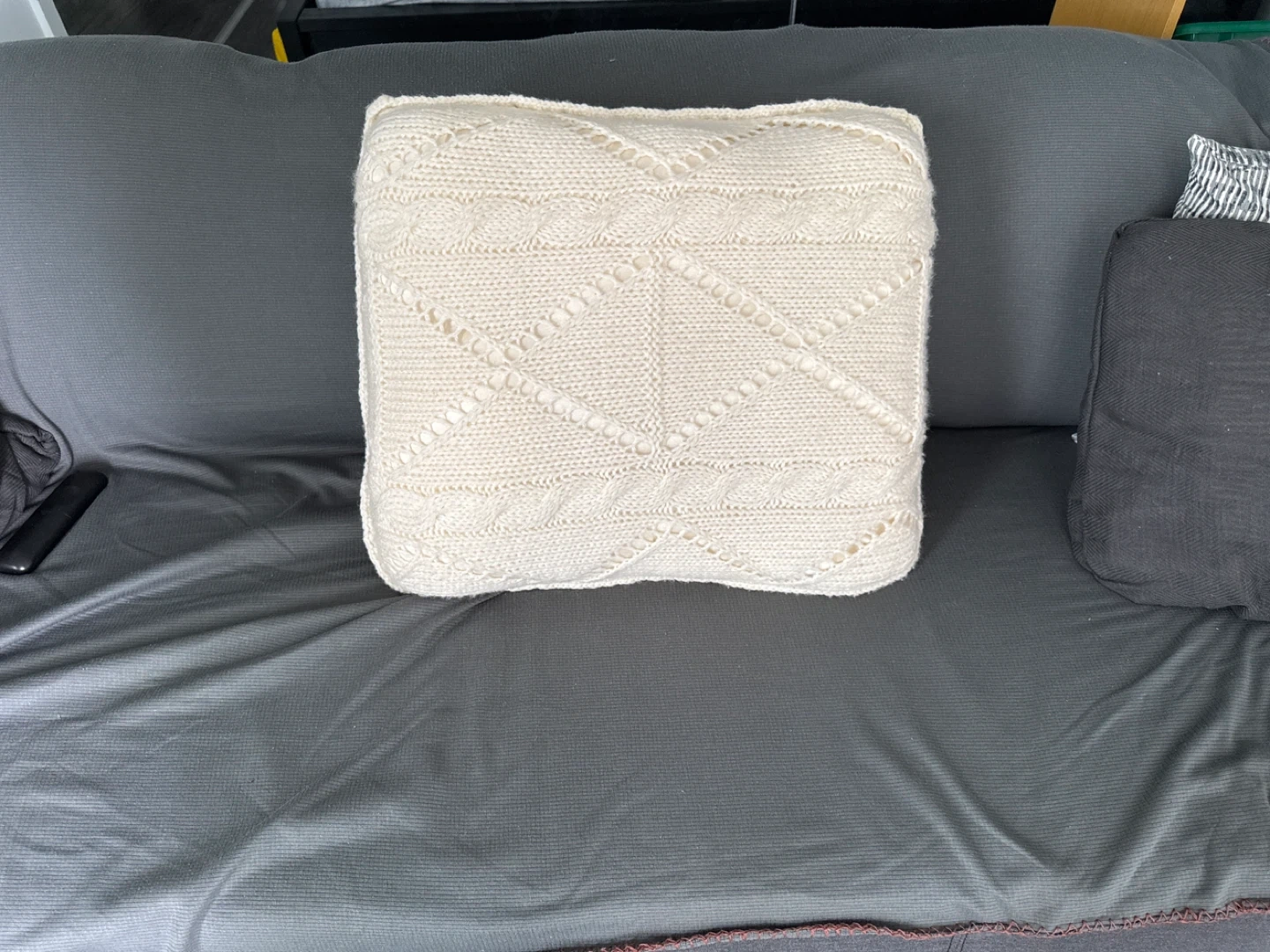 Selling a cream-coloured knit throw pillow. It's in great condition and would look lovely on a couch or bed. The knit pattern is a classic cable knit design. It's a soft material and perfect for adding a cozy touch to your space