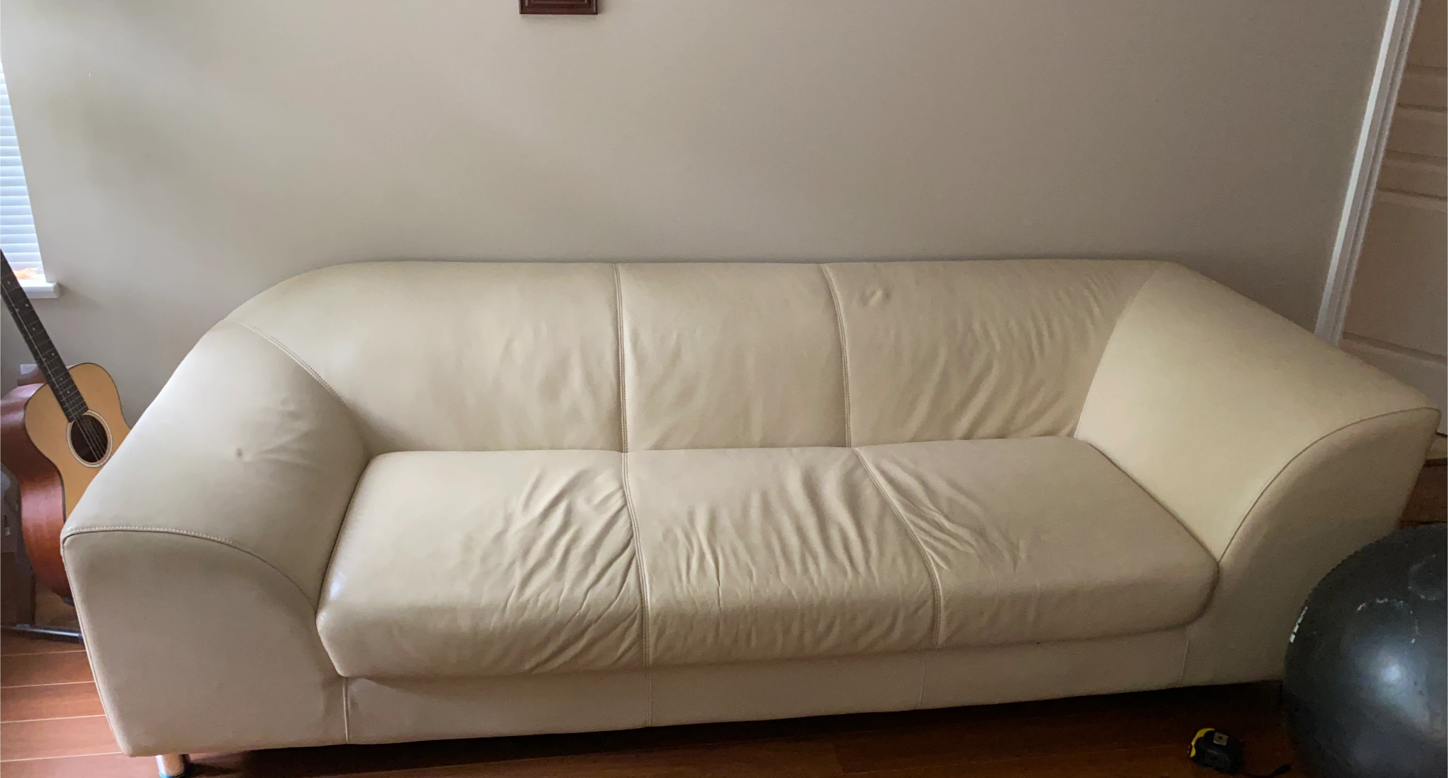 Selling a comfy cream-coloured leather sofa. It's in good condition and perfect for a living room or den. The leather is soft and the cushions are still supportive. Great for lounging!