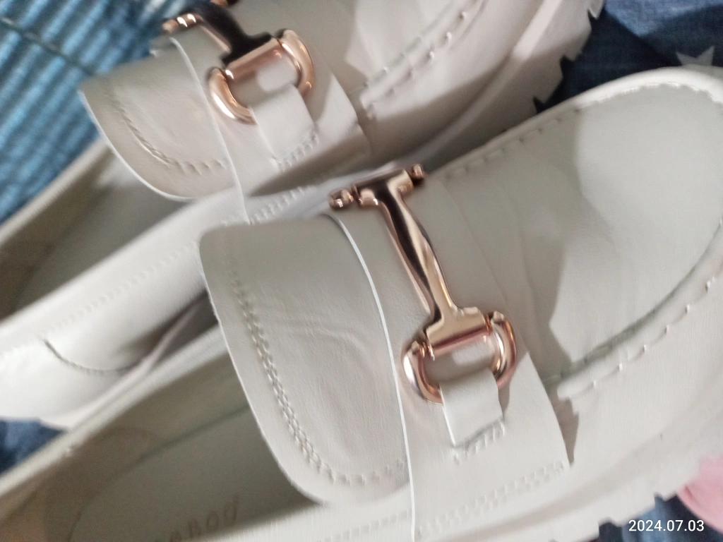 Adorable cream-coloured platform loafers. Features gold-toned hardware accents. Chunky platform sole. Slip-on style.