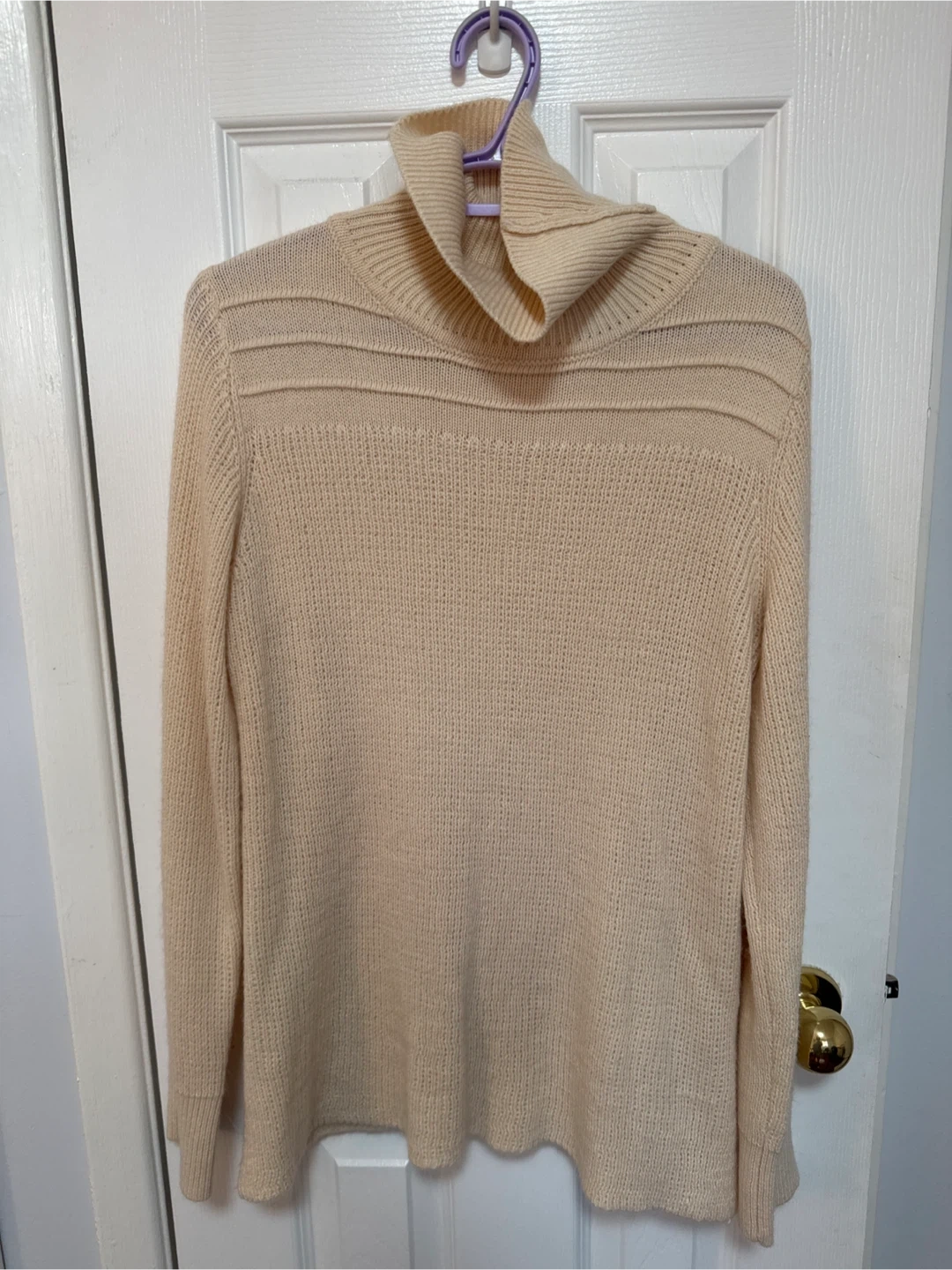Selling a cozy cream-coloured turtleneck sweater! It's in great condition and perfect for the cooler weather. The material is soft and comfortable, making it a great addition to any wardrobe
