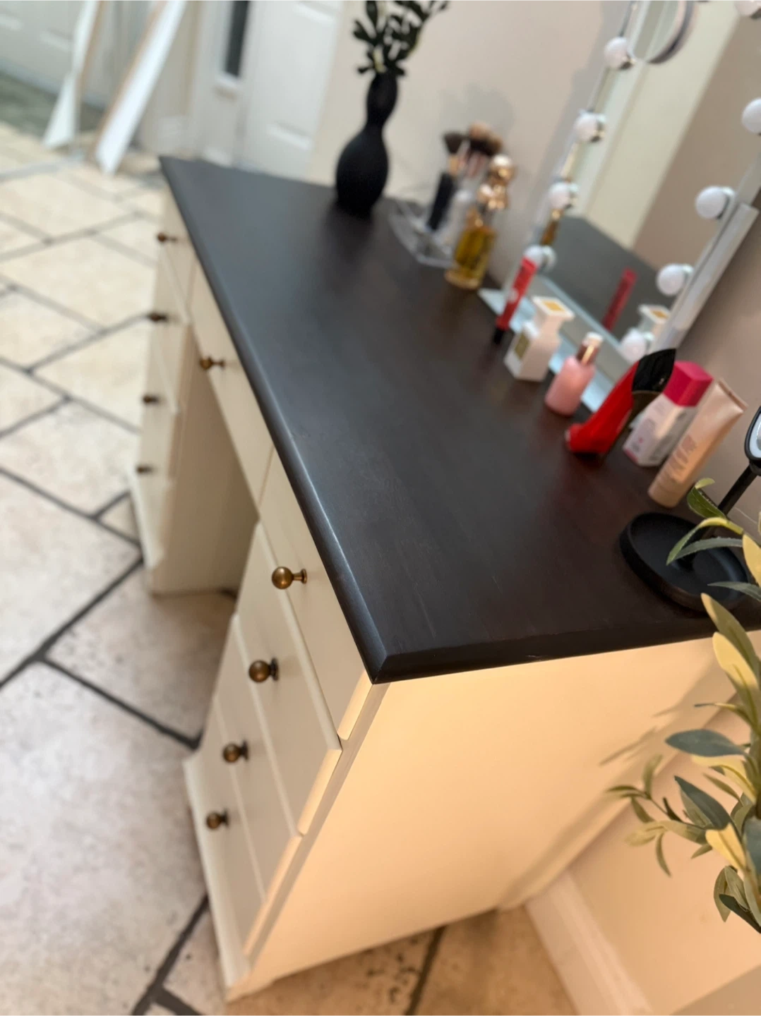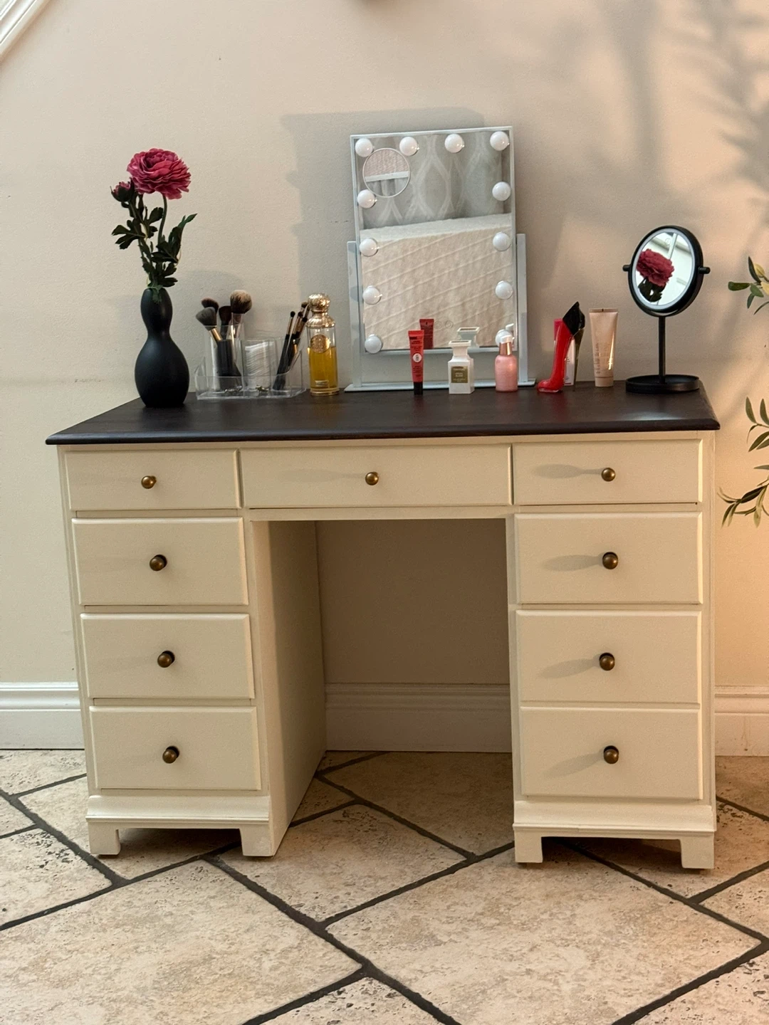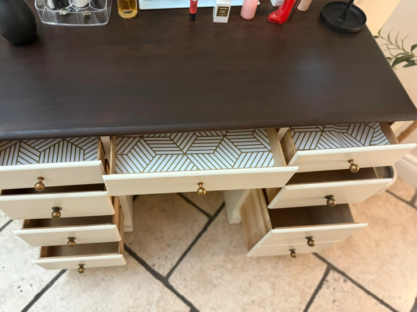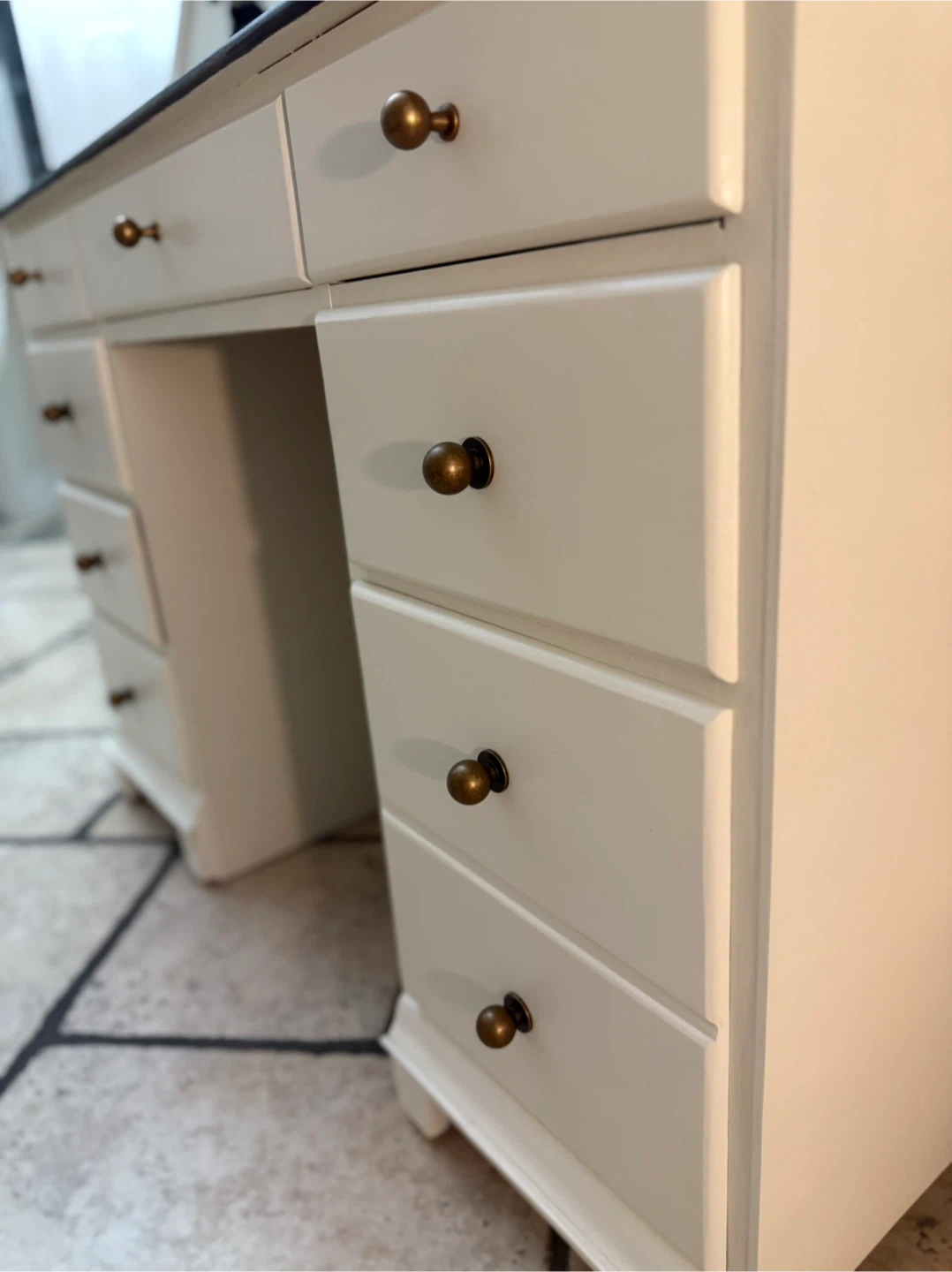 Refinished vanity desk. It features a dark stained top and lots of drawers for storage, lined with a cool geometric pattern. Perfect for a bedroom or dressing area! Paint used: Raw Silk by fusion mineral paint Top coat: Satin Varathane diamond wood finish W 43” L 30” D 20” Check out my other listings!!! Delivery available for a small fee!