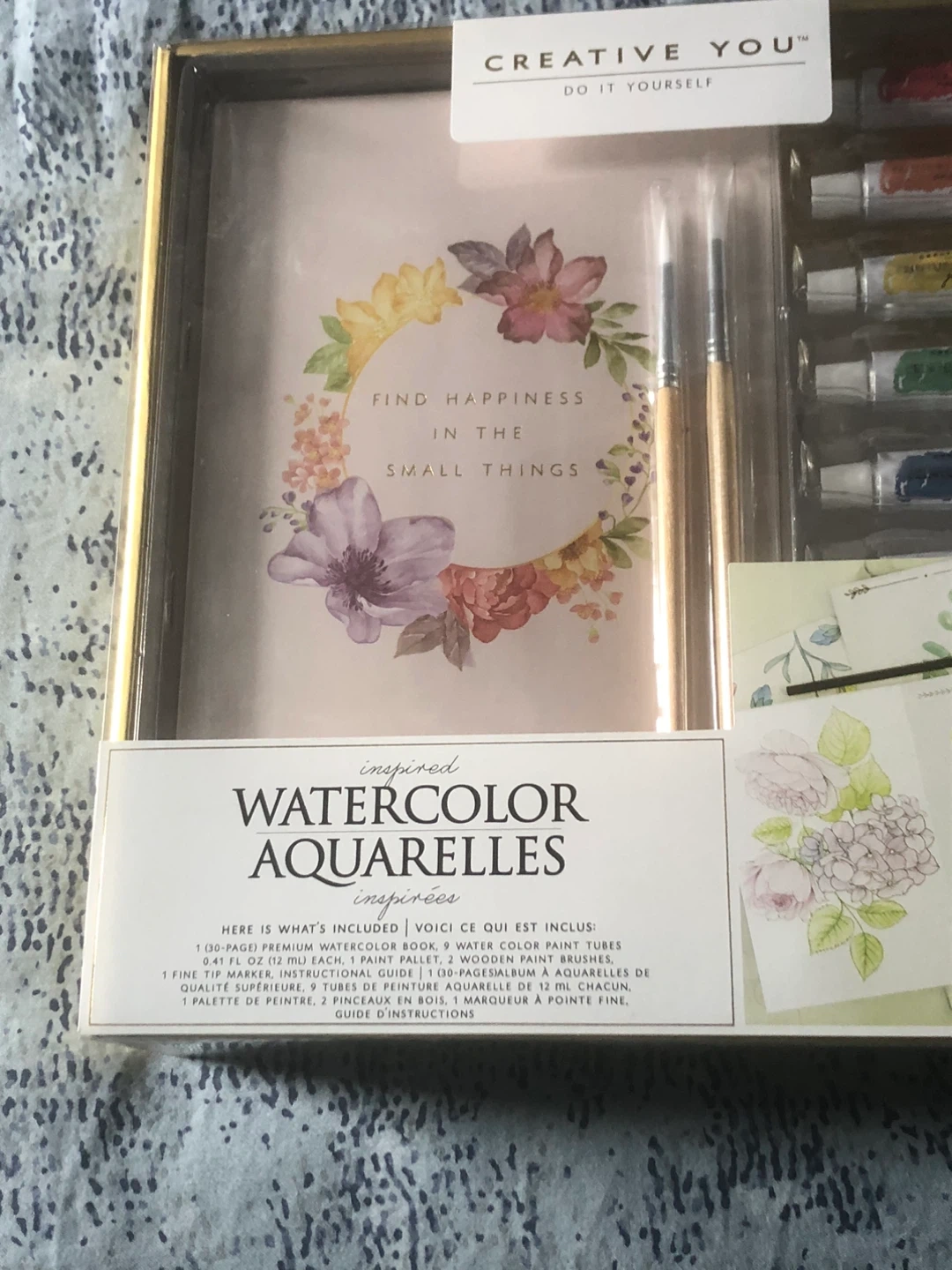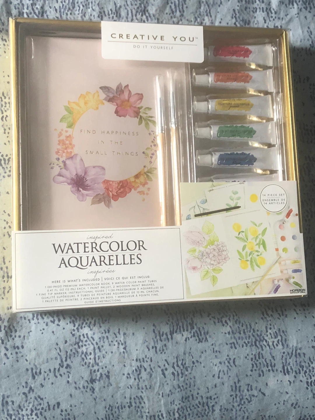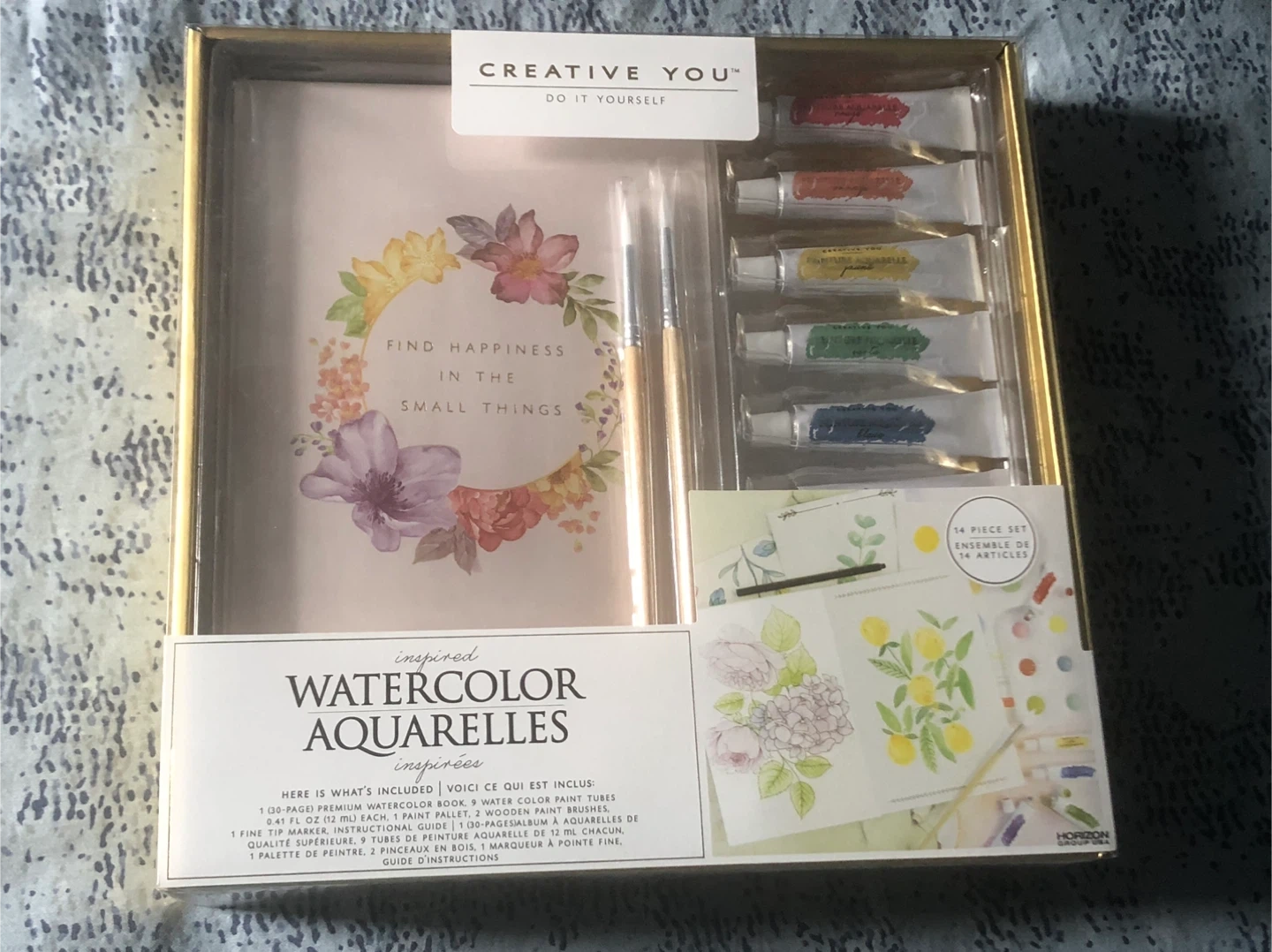 This is a brand new Creative You Inspired Watercolor Aquaralles set! It includes: - 100-page premium watercolour book - 9 watercolour paint tubes (0.41 fl oz each) - 3 wooden paint brushes - 1 fine point marker - 100-page watercolour guide - 1 paint palette - Instructions