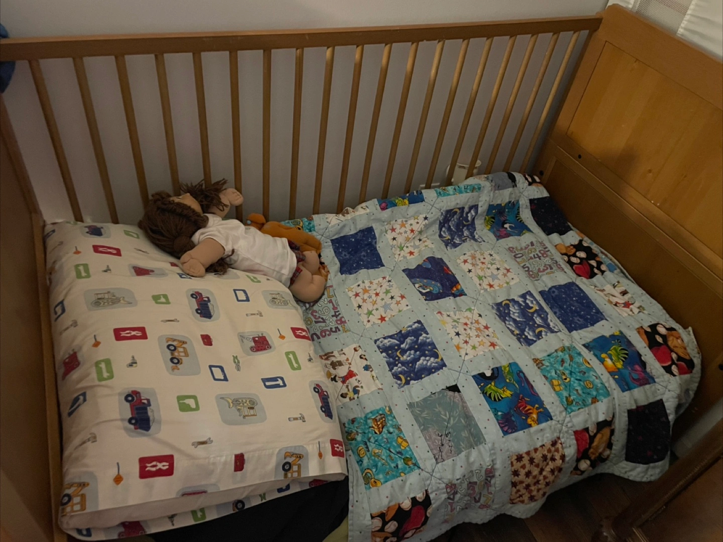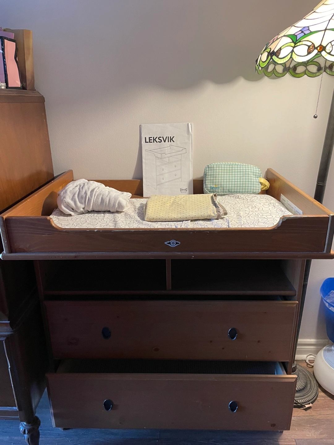 À vendre : Couchette et table à langer-tiroirs Leksvik, avec matelas et draps assortis. Usagé; a servi à deux bébés. 175$ Selling: Leksvik changing table with drawers and 3-in-1 crib with assorted mattress and sheets, including two mattress protector sheets. UC; used for 2 kids over 10 years. 175$ Pick up near St Lawrence Market. (Dolls and quilt not included.)