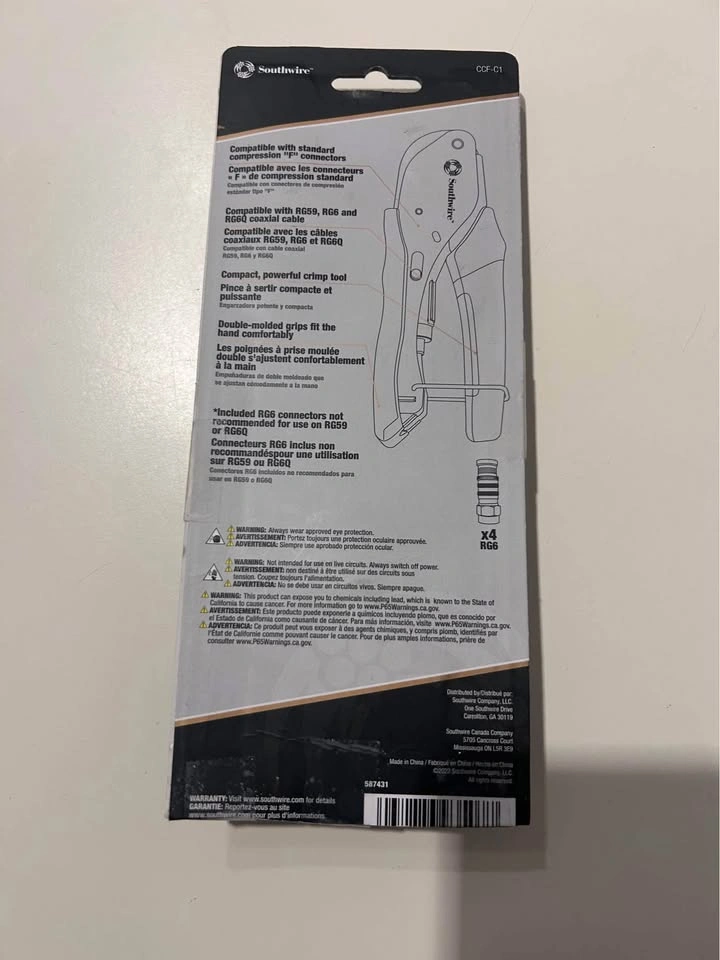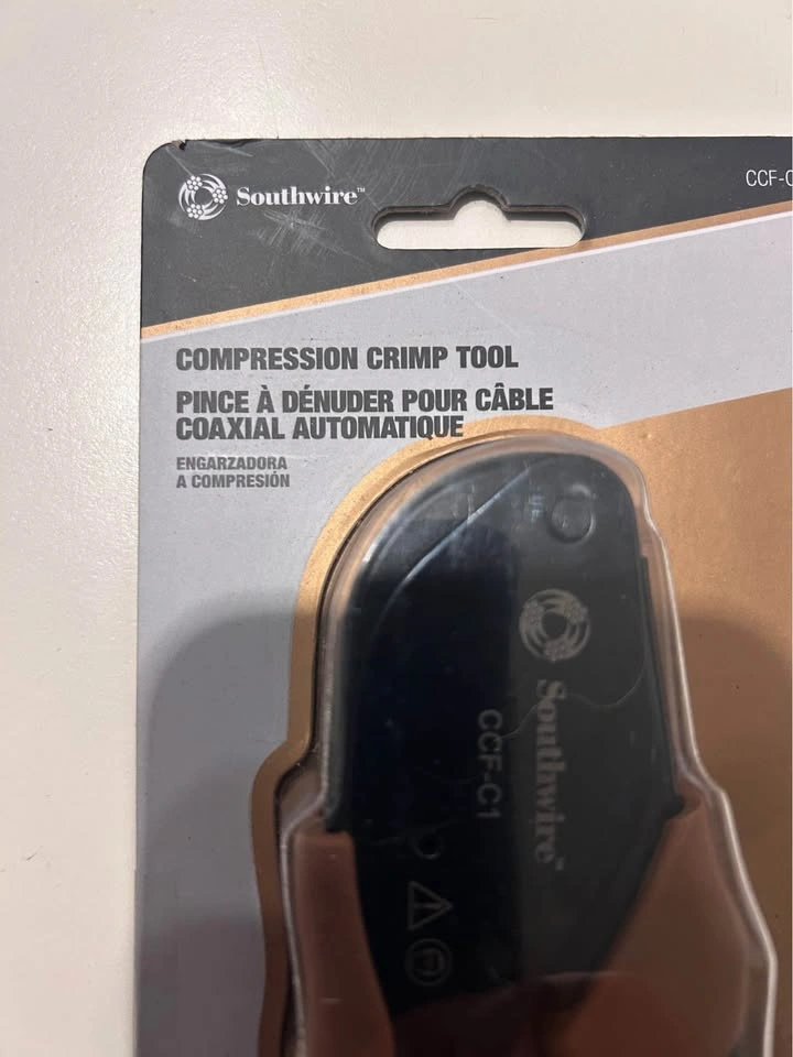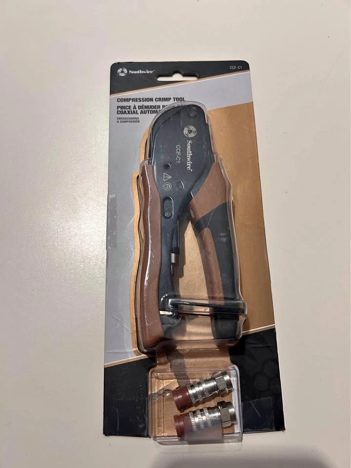 Used to attach 20.3 mm Cable TV “F” type connectors to coax cable in a single easy step. Really comfortable grip with lots of power. Works with RG59, RG6 and RG6Q coax cables. Only used it to attach 2 connectors, other than that it’s brand new.