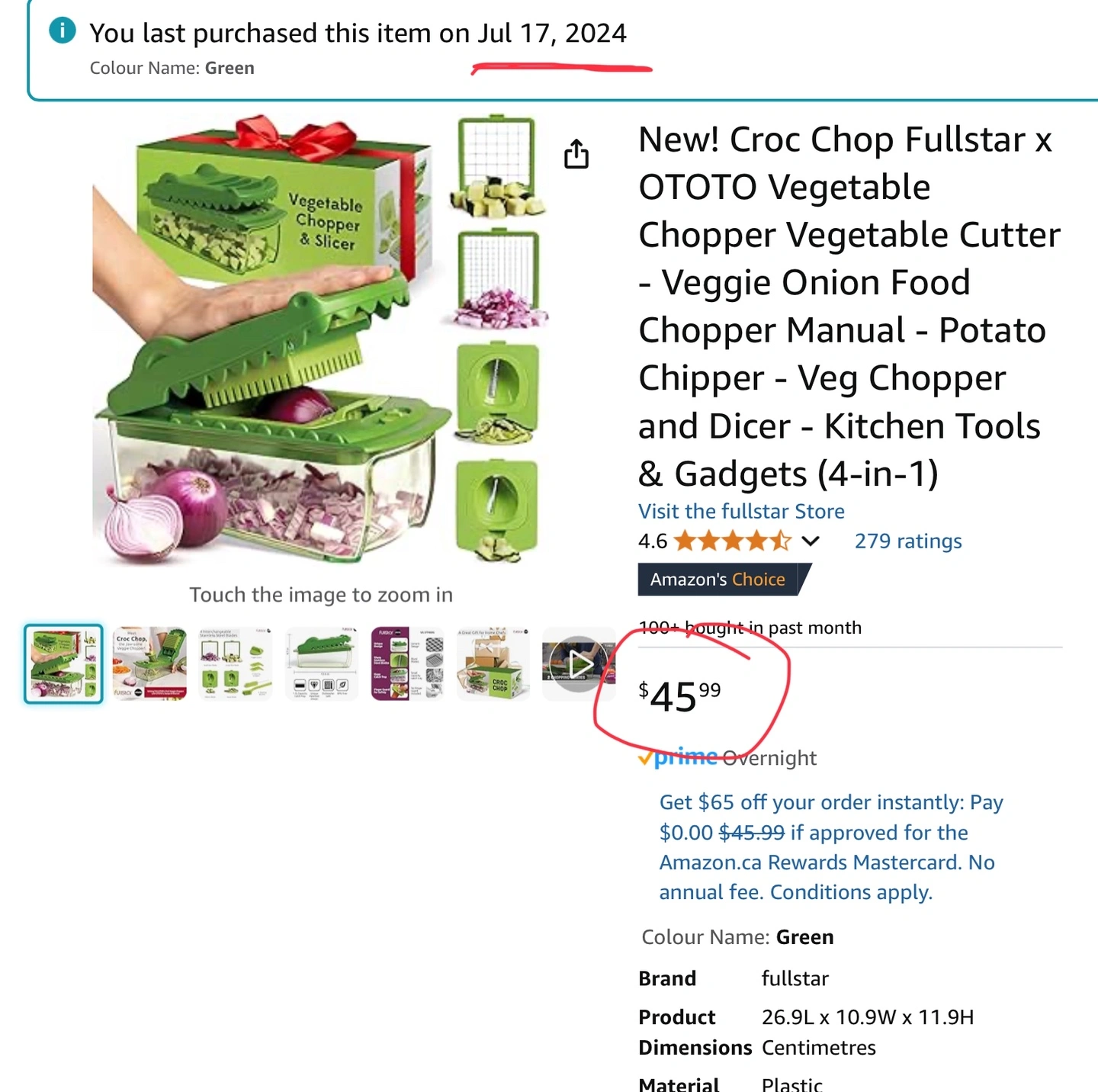 I'm selling a Croc Chop Fullstar vegetable chopper and slicer in great condition! It's a fantastic kitchen tool for chopping veggies quickly and easily. The dimensions are 26.9L x 10.9W x 11.9H in centimeters. It's made of durable plastic and originally bought for $45.99. It includes all the parts shown in the picture and the original manual