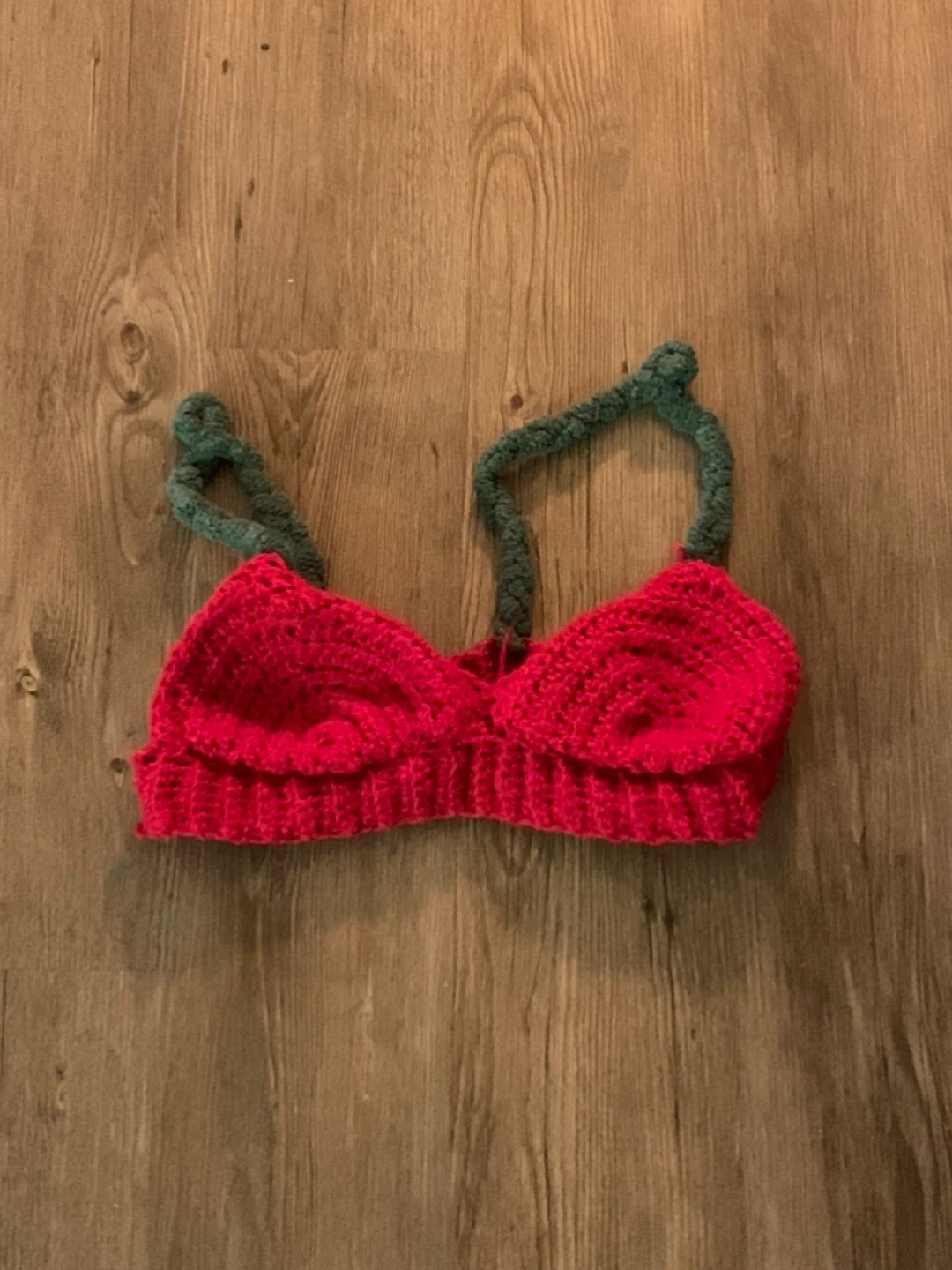 Selling a cute, handmade crochet bra top, cherry themed. It's in great condition and perfect for summer! Bra padding is additionally sewed into the top.