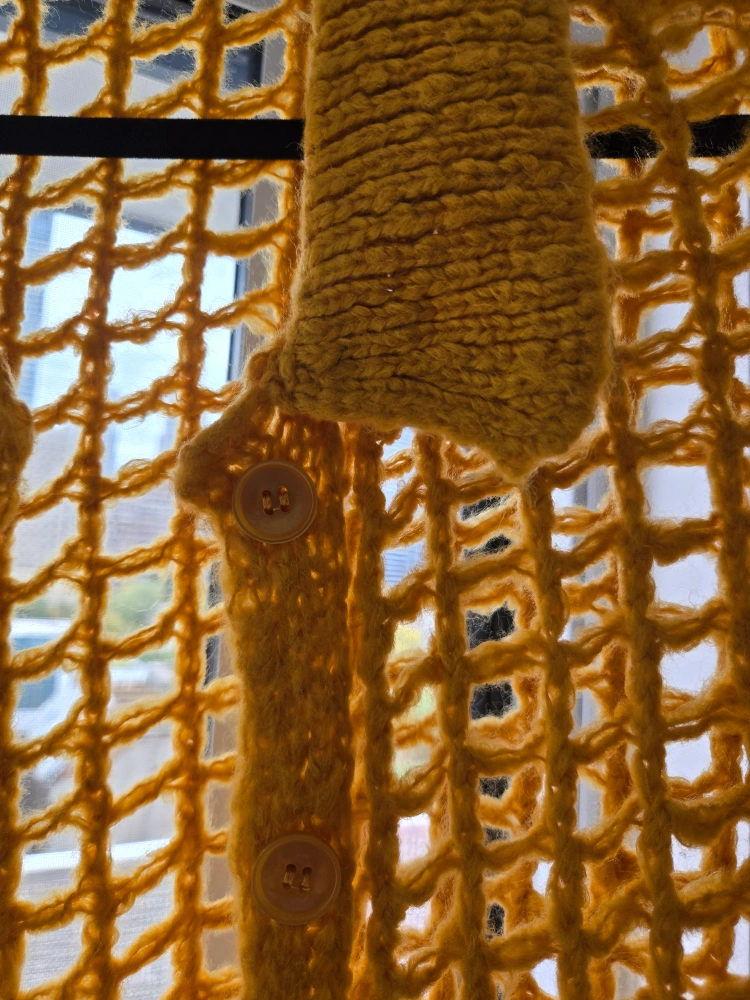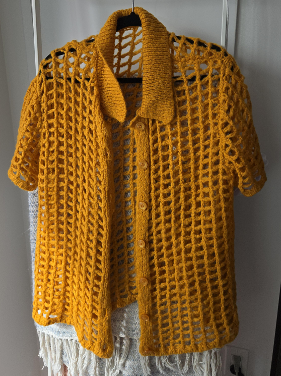 Selling a unique crochet knit button-up top in a lovely mustard yellow colour. It's a stylish and breathable piece, perfect for layering or wearing on its own. The open knit design adds a touch of texture and visual interest to any outfit. It is in great condition!