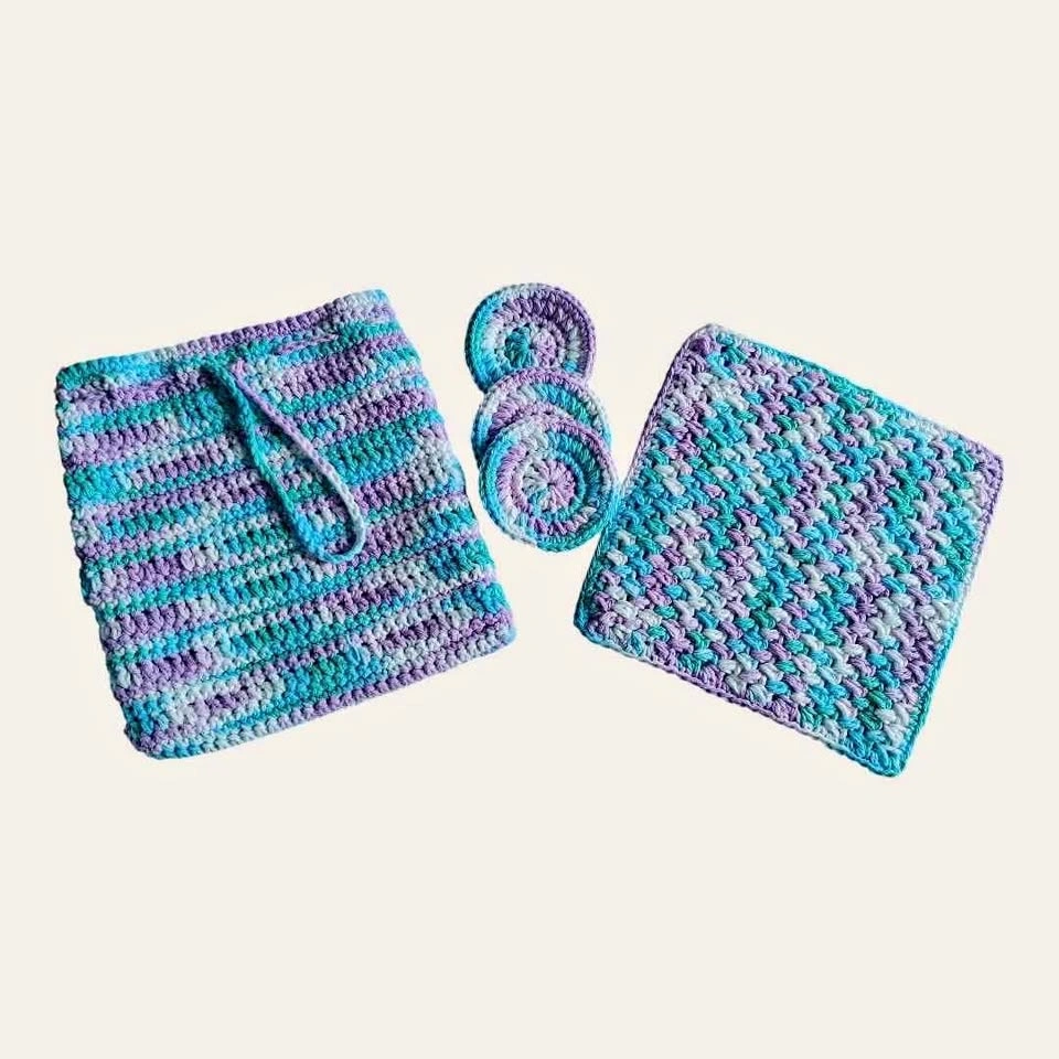 Crochet spa set 1 washcloth 3 face scrubbies 1 toiletries bag Pick up Highland Green