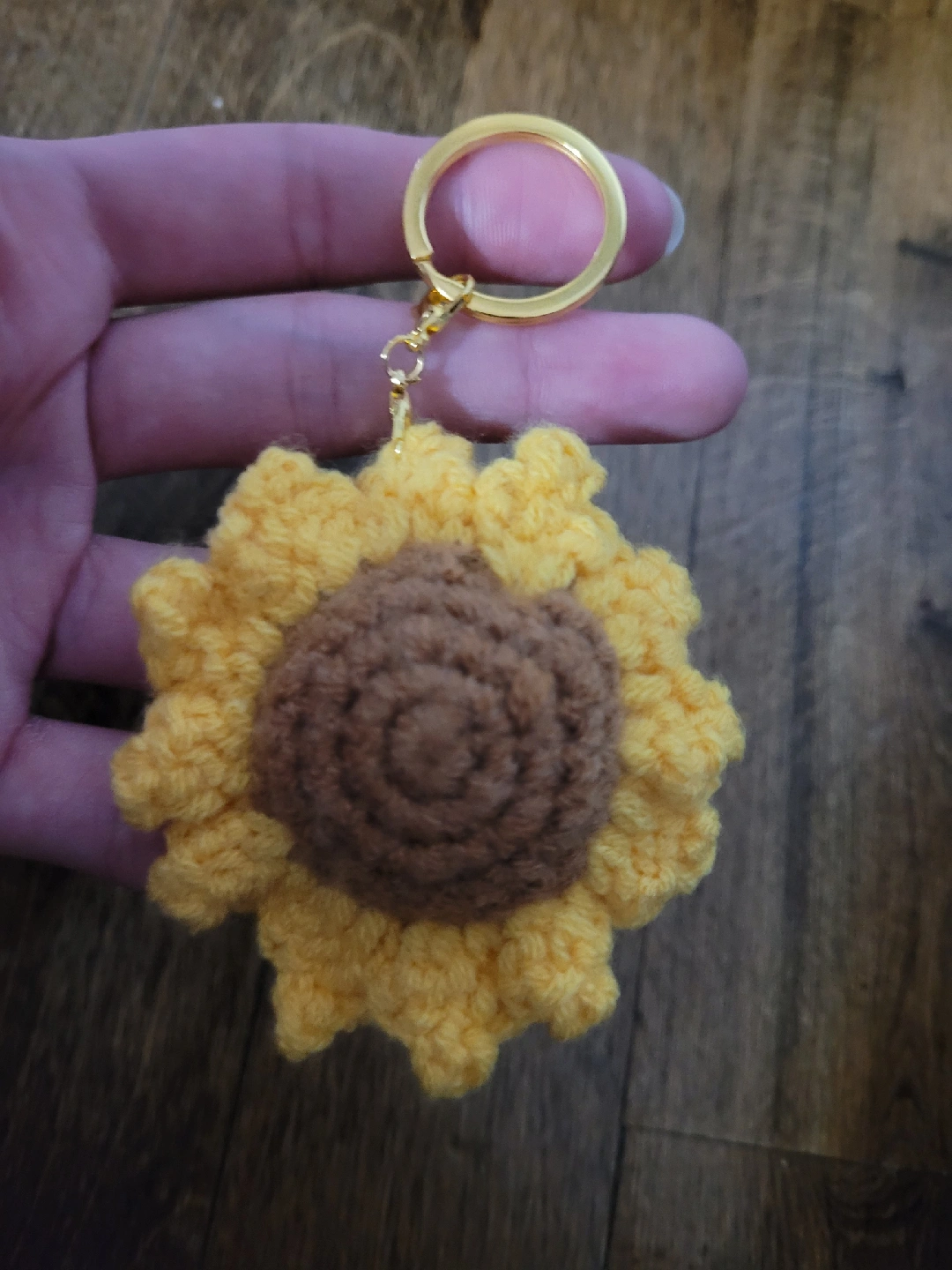 Check out this adorable crochet sunflower keychain! It's made of soft yellow and brown yarn. Perfect for adding a touch of sunshine to your keys or bag!