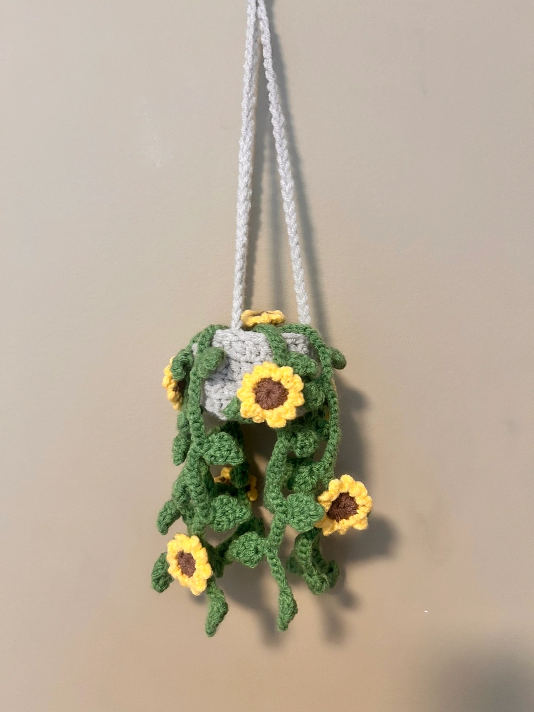 This adorable crocheted sunflower plant hanger is handmade with love! It's perfect for adding a touch of whimsy and colour to any room. The hanger features a grey pot with vibrant green vines and cheerful yellow sunflowers. A unique piece to brighten up your space!