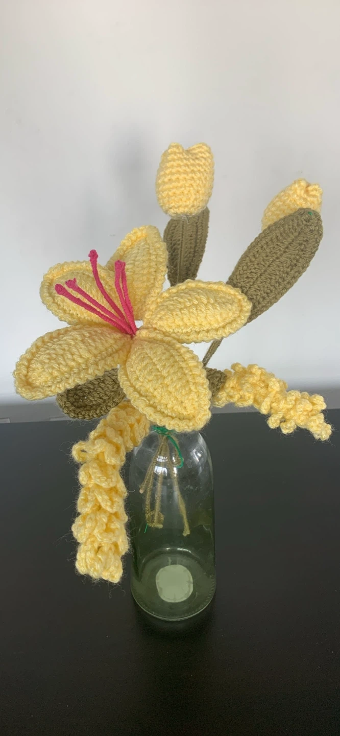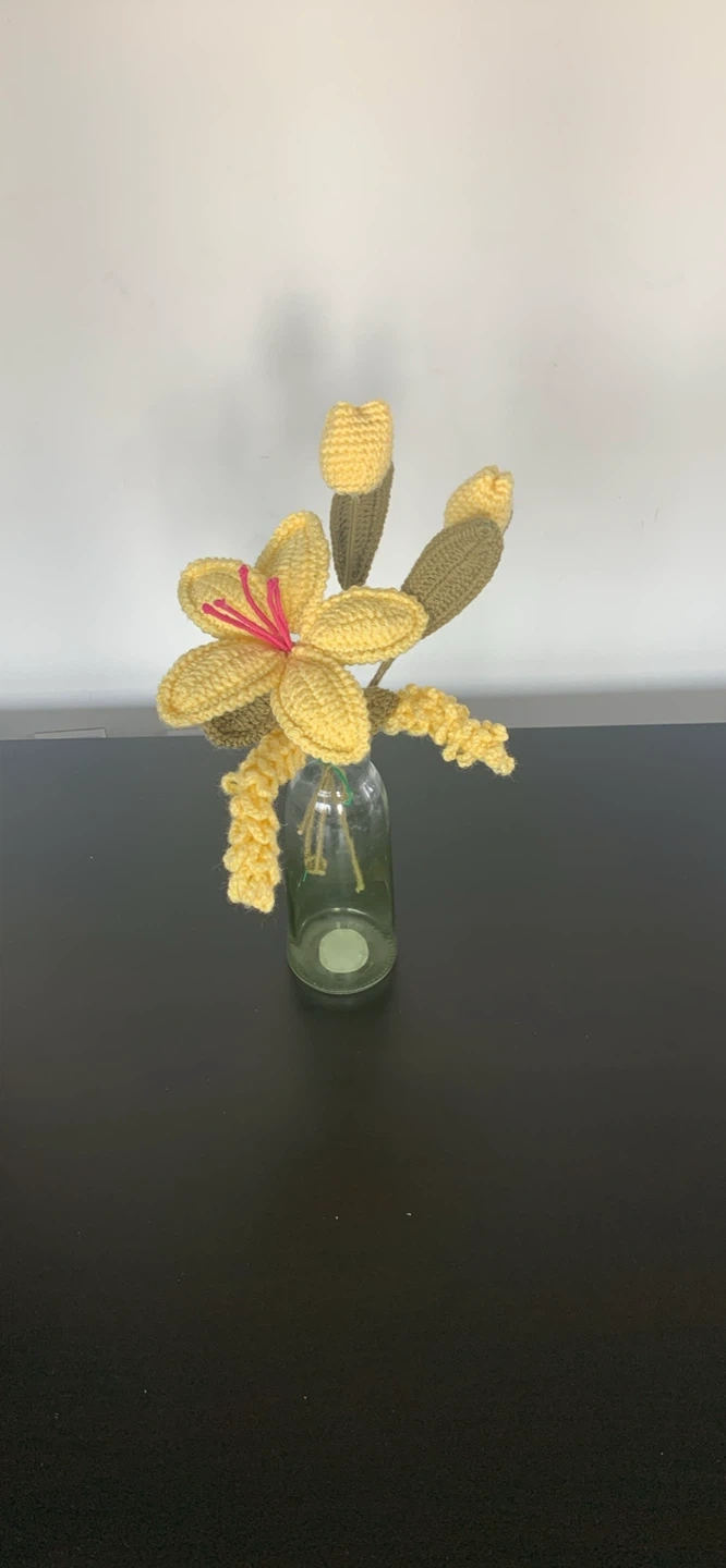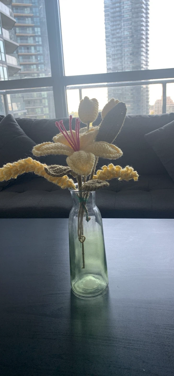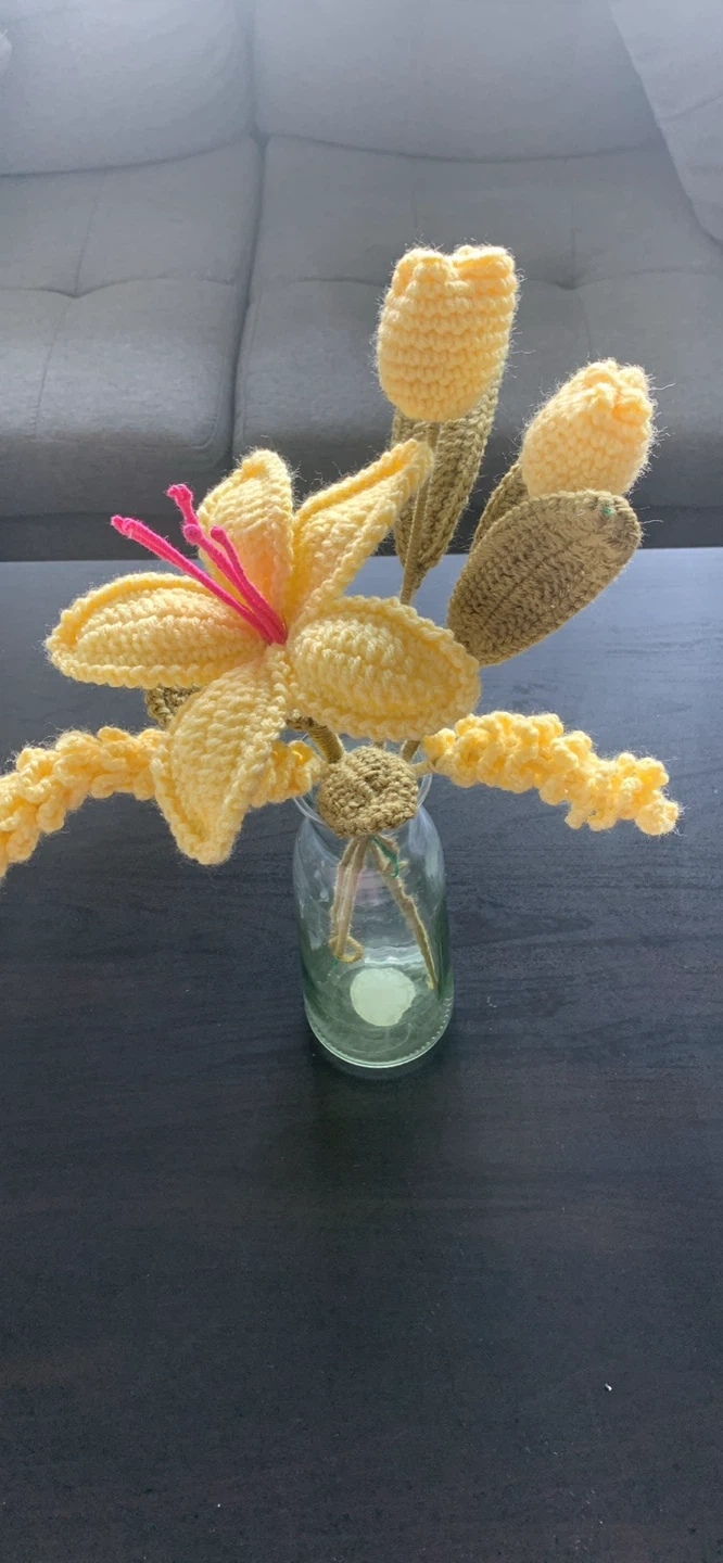 Selling a handmade crocheted yellow lily arrangement in a glass vase! It's a lovely, unique piece that would add a touch of charm to any room