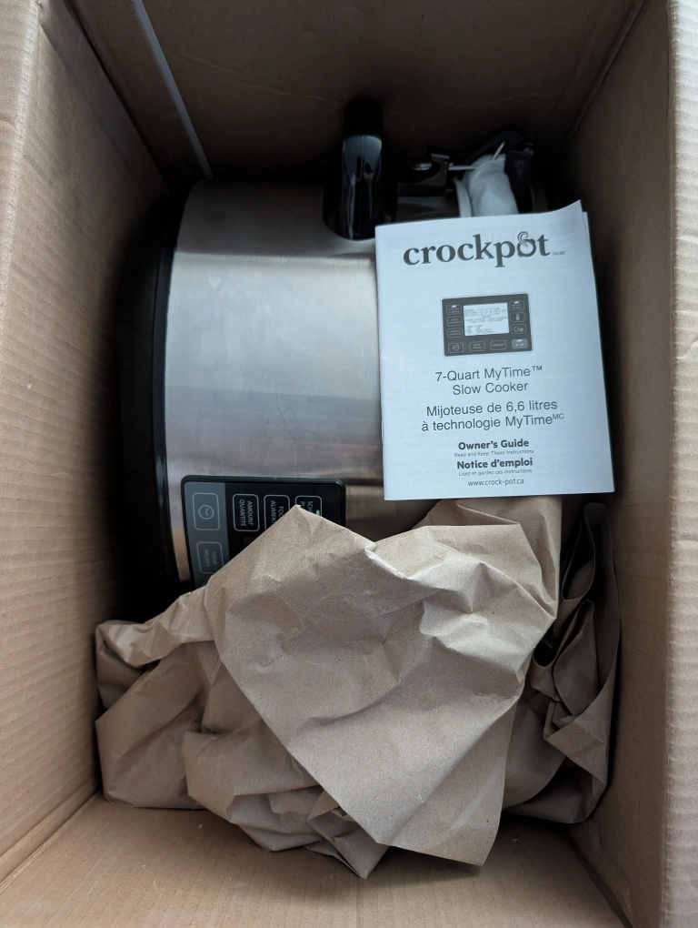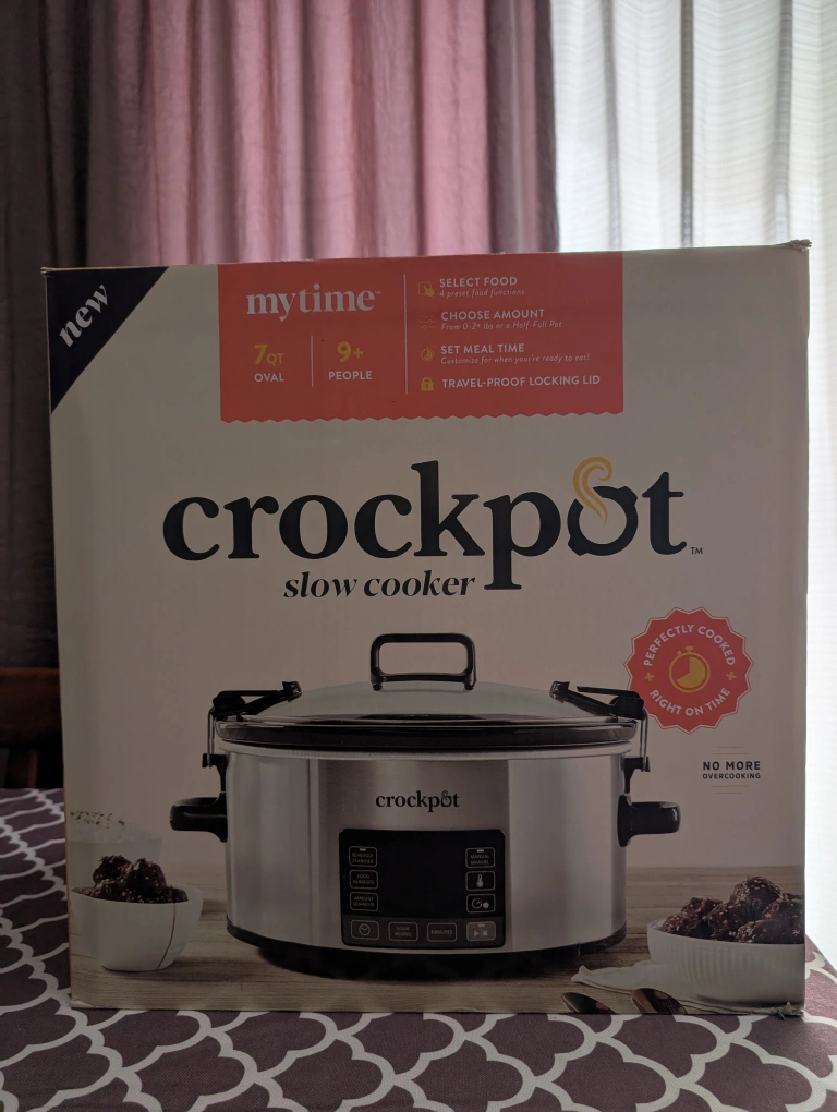 "MOVING SALE" Crock-Pot 7-Quart Programmable MyTime Slow Cooker. MyTime Technology: This feature automatically adjusts the cooking cycle to have a meal ready at a specific time you set. Capacity: The 7-quart capacity is suitable for family meals and can feed 9+ people. Programmable Controls: You can set cook times from 30 minutes to 20 hours. Once cooking is complete, it automatically switches to a warm setting to prevent overcooking. Easy Cleanup: The removable stoneware and lid are dishwasher-safe, and the stoneware is also oven-safe up to 400°F. Locking Lid: The lid has a tight seal and locking feature, making it suitable for mess-free transport. Comes with the box. Only used once. PICK UP ONLY. CASH ONLY.