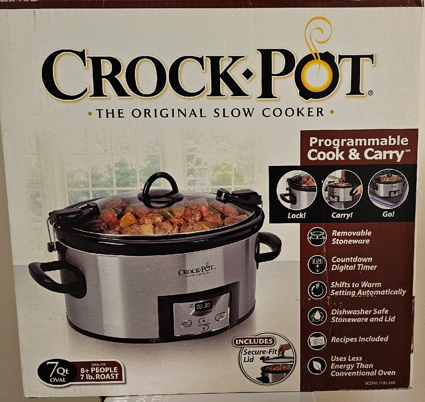 Selling a Crock-Pot Programmable Cook & Carry slow cooker! It's the original slow cooker and has a 7Qt oval stoneware that's ideal for 8+ people or a 7 lb roast. Features include: - Removable stoneware - Countdown digital timer - Shifts to warm setting automatically - Dishwasher safe stoneware and lid - Includes recipes - Uses less energy than a conventional oven
