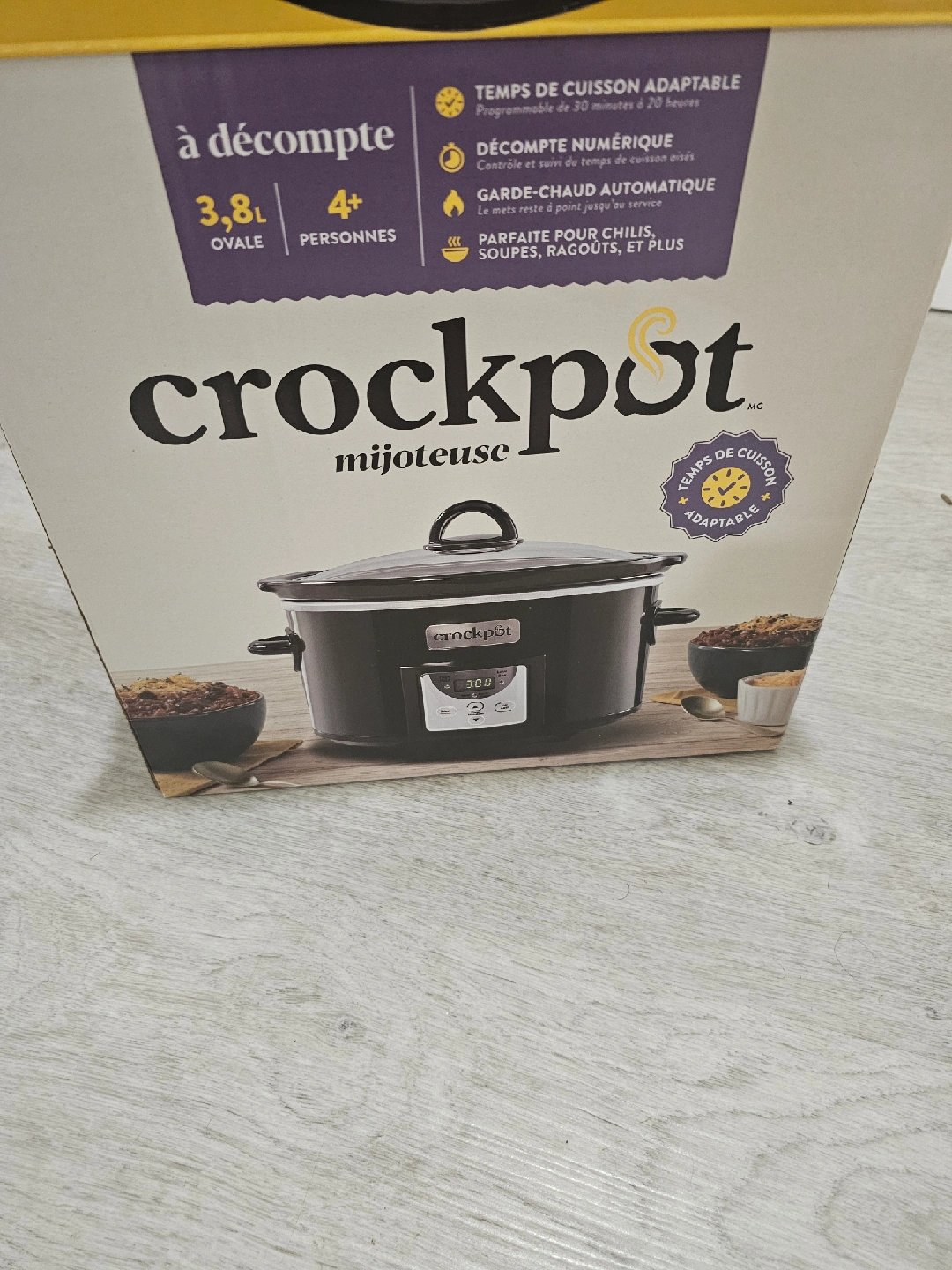 Never used, open box. Selling a Crockpot mijoteuse slow cooker. It's 3.8L and perfect for 4+ people. It has an adaptable cooking time, programmable from 30 minutes to 20 hours. It also features a digital countdown, automatic keep-warm function, and is perfect for chilis, soups, ragouts, and more!