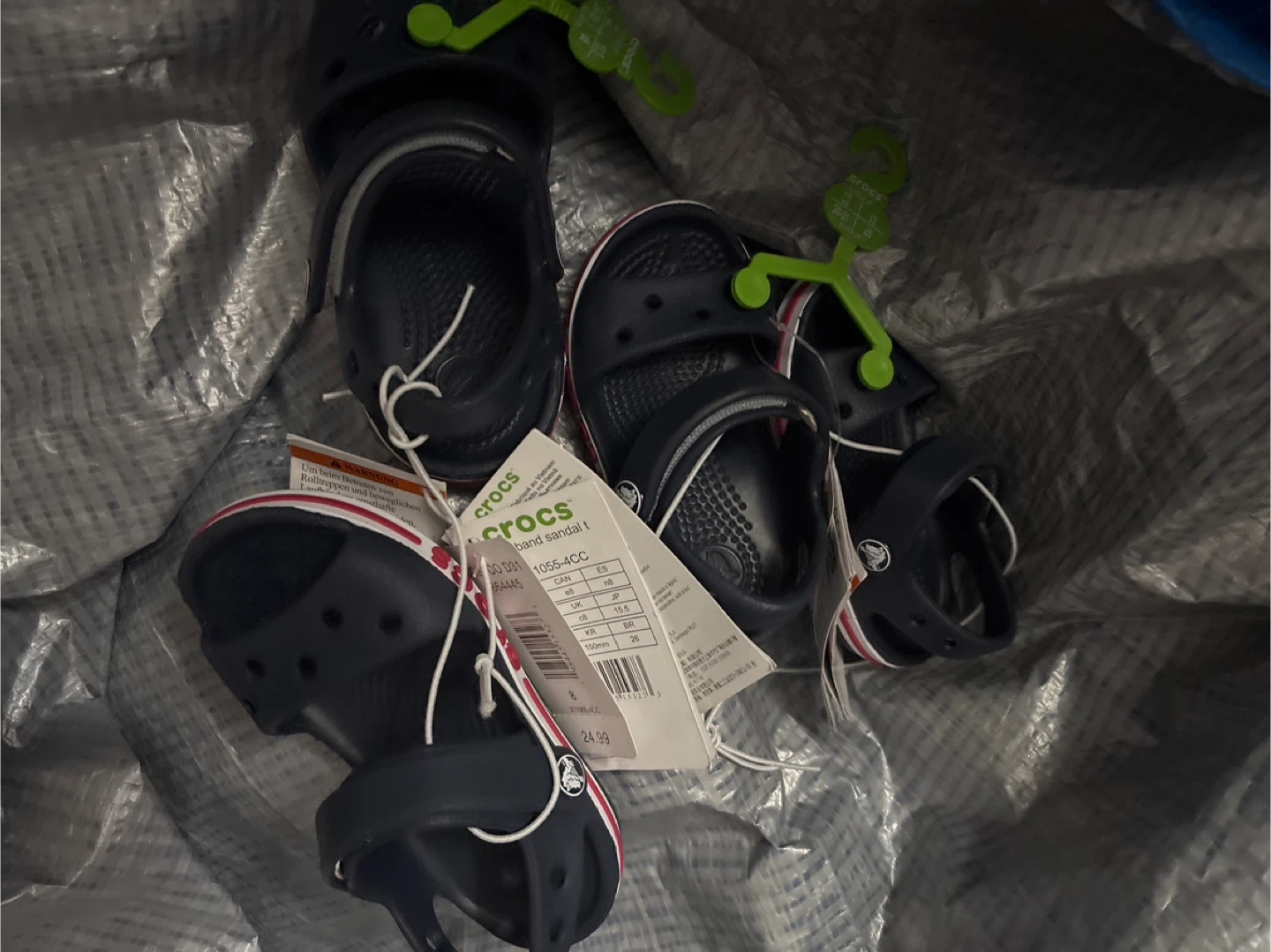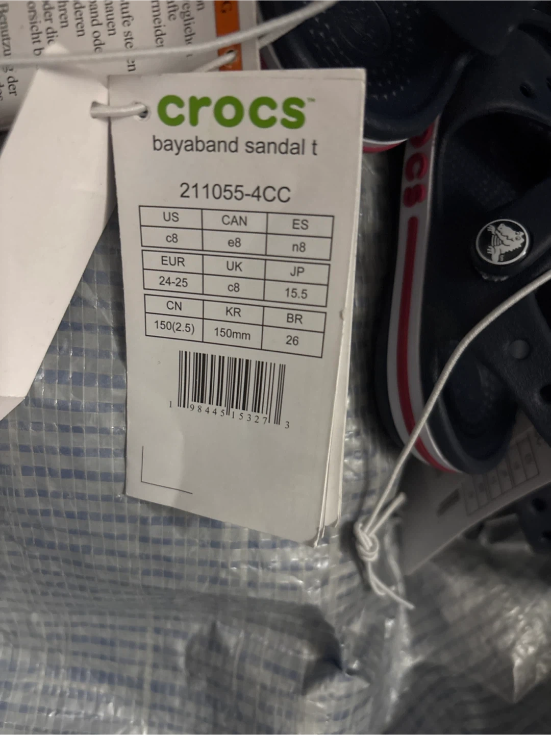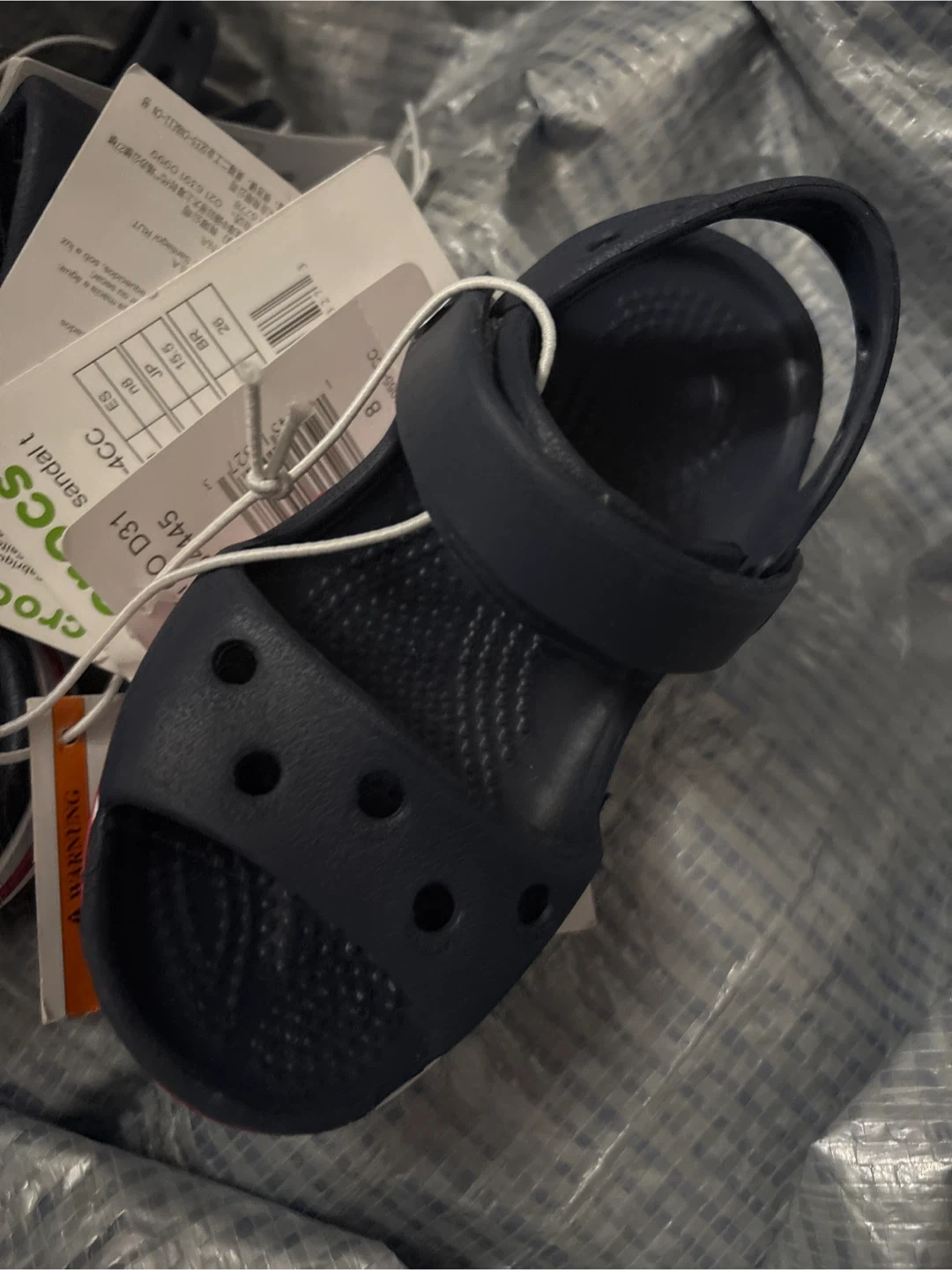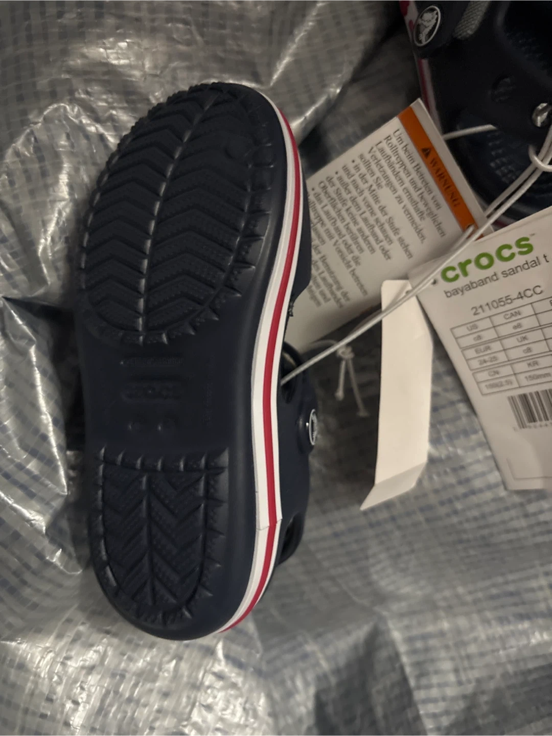 Selling a brand new pair of Crocs Bayaband Sandal T in sizes 5C or C8. They are a navy blue colour with a white and red stripe. Perfect for kids!