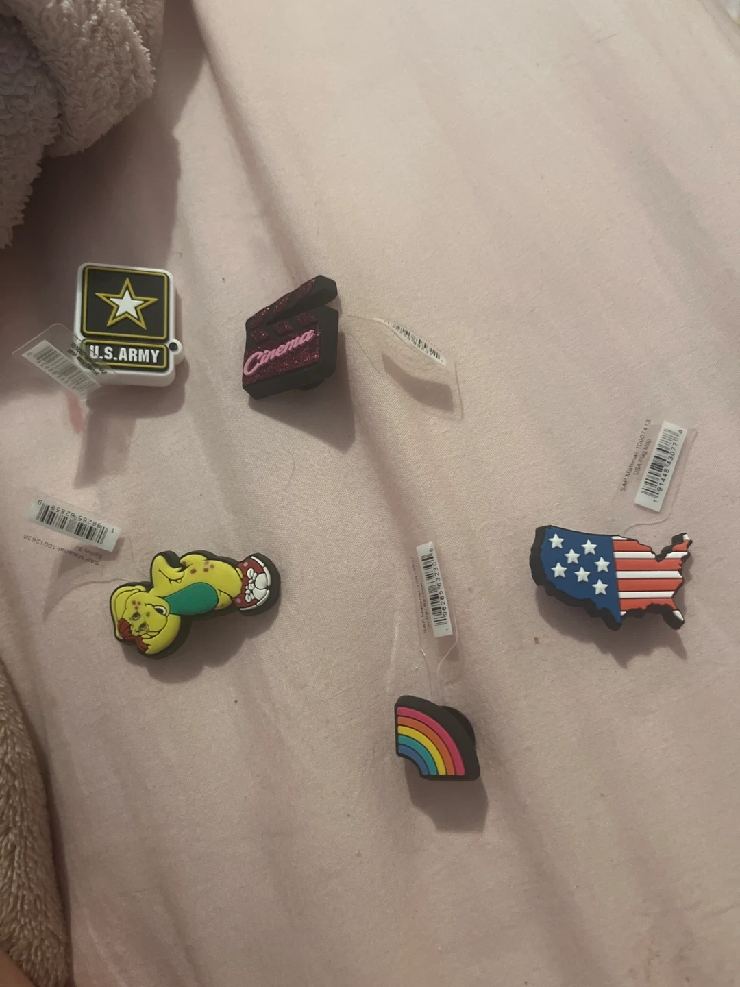 Selling a variety of Crocs Jibbitz charms! Includes: - U.S. Army star logo - Cinema clapboard - Barney the Dinosaur - USA Flag Map - Rainbow (One dollar each)